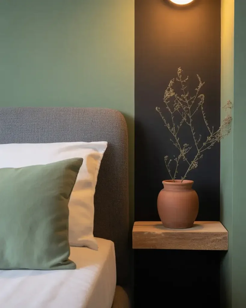 The combination of matte black and sage green is one of the biggest bedroom color stories heading into 2026. Unlike deep forest green, sage brings a muted, almost misty quality that softens black rather than competing with it. Think sage linen pillowcases against a black bed frame, or a sage green painted wall adjacent to a near-black wall. Add dried botanicals, natural wood accessories, and a linen throw in a related earthy tone to complete the earthy-minimal vibe. This palette rewards organic textures: unbleached cotton, raw clay, and weathered wood.