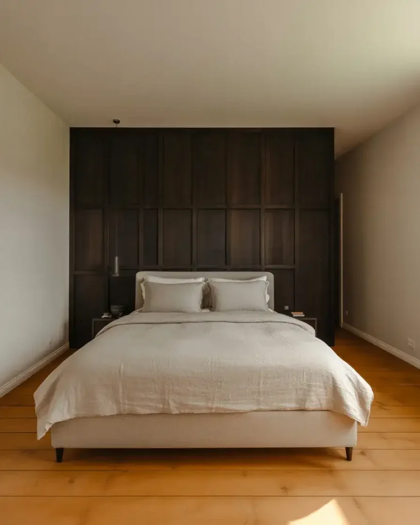 Combining a wood and paneled accent wall painted in matte black is one of the most architectural moves you can make in a bedroom—and it’s become a signature look for homes that want to reference mid-century or craftsman lineage while staying firmly contemporary. Black-stained shiplap, board-and-batten in charcoal, or limewash over tongue-and-groove paneling all bring texture to the dark surface in a way that flat paint can’t. This inspo rewards layered light: a pendant over the bed, wall sconces at reading height, and soft ambient light from the opposite side.