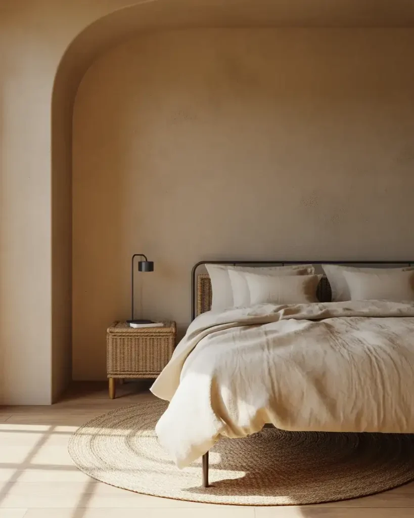 The pairing of beige and black is the design world’s answer to a classic tuxedo—timeless, sharp, and warmer than you’d expect. In a bedroom context, this translates beautifully: black-framed windows or a black accent wall paired with warm beige linen, cream plaster walls, and natural rattan or cane furniture decor ideas. The contrast is graphic without being cold. A creamy jute rug, a linen duvet in oat or camel, and a single matte black floor lamp can completely transform a builder-grade room into something that feels designed.