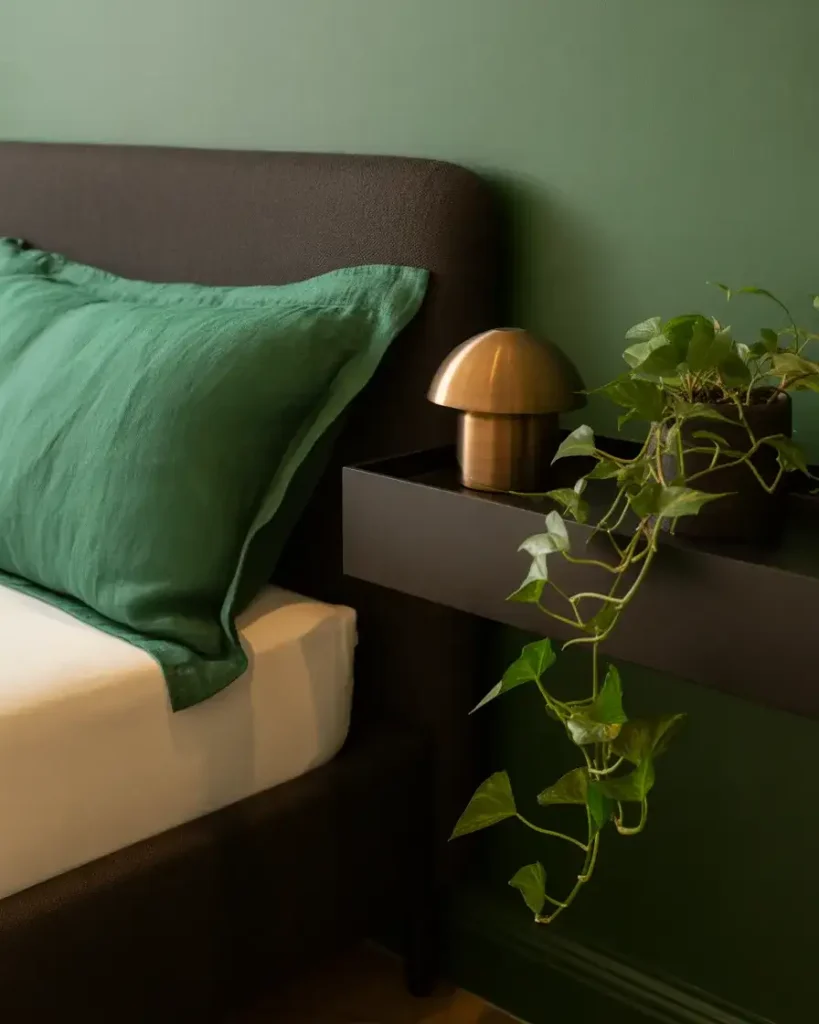 Where this look works best: north-facing rooms, which often read cold with traditional palettes. Dark green absorbs the blue-grey quality of north light beautifully and makes the room feel warmer than it actually is. A designer once noted that clients who were afraid of north-facing bedrooms were often converted immediately after seeing deep green on the walls—the color does something psychologically warming that no amount of yellow paint can replicate.