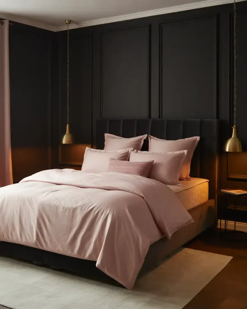 The pairing of pink and black is one of those combinations that sounds risky on paper and looks stunning in person. Dusty rose or blush softens the severity of black walls, while the black prevents the pink from reading as juvenile. This aesthetic hits a sweet spot between feminine and dramatic—it’s the bedroom equivalent of a red lip with a classic blazer. A black velvet headboard against a pale blush wall, or deep charcoal walls with pink linen and brass hardware, both nail this energy without tipping into cliché.