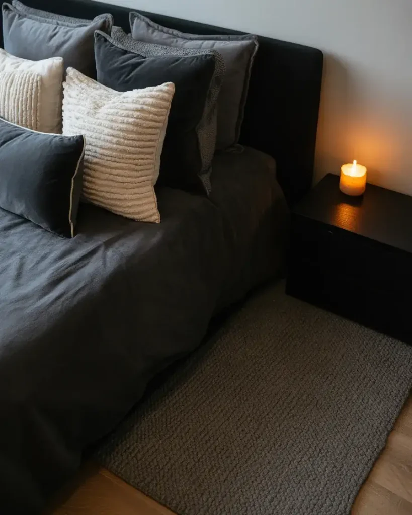8. Cozy Black Bedroom with Layered Textiles