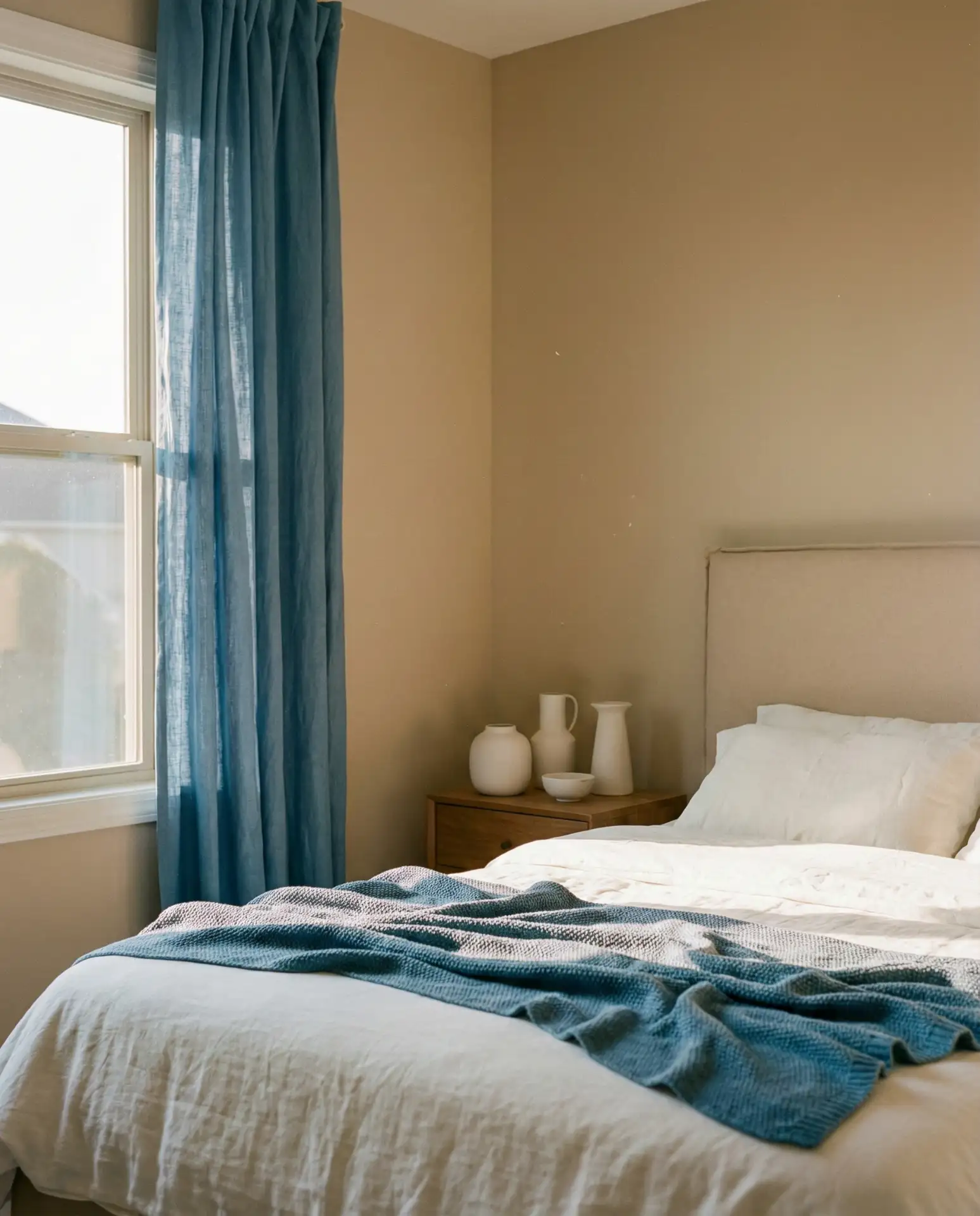 The beige and blue combination creates a warmer alternative to the stark blue-and-white schemes that dominated earlier years. Use a warm beige or greige on three walls and reserve blue for an accent wall or introduce it through textiles and accessories. This approach suits homeowners transitioning from all-neutral spaces who want to experiment with color without full commitment. The beige provides safe grounding, while the blue adds just enough personality to prevent blandness. This soft color story appeals to a broad audience, making it excellent for guest rooms or homes being prepared for sale.