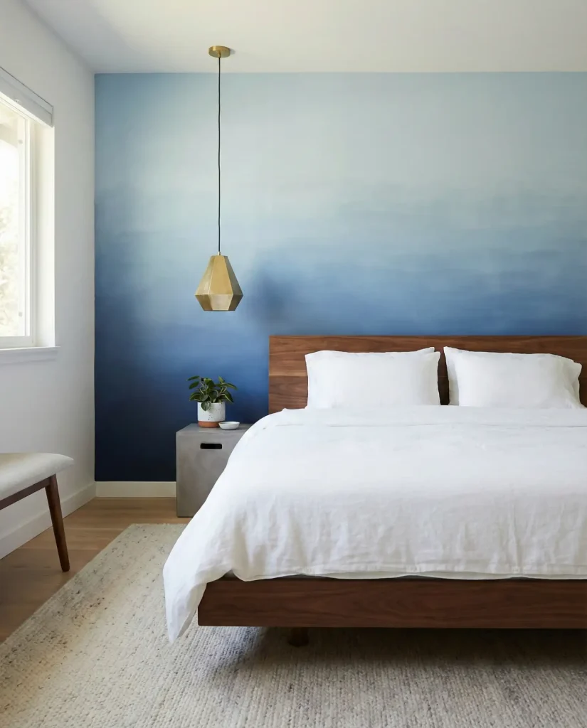 Real homeowners attempting this technique report that success requires patience and the right tools—a quality wide brush or roller specifically designed for blending is essential. Practice on poster board first to develop your technique before committing to the wall. The gradient should be subtle; too dramatic, and it looks like a teenager’s bedroom from 2005. Choose three to four shades of blue in the same color family, which makes blending easier than trying to work with just two very different tones. This treatment works best on the wall behind the bed, which becomes a natural focal point without competing for attention throughout the entire room.
