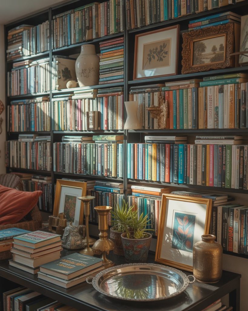 The eclectic style thrives on personality. Mix books with thrifted vases, vintage art, and a silver tray for candles. A colorful arrangement of spines and souvenirs gives life to tall shelves that stretch from floor to ceiling. Perfect for a living room or studio where your collections can breathe freely.