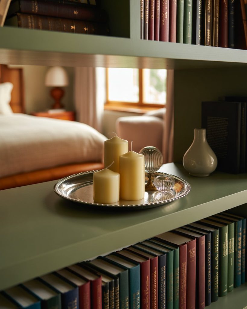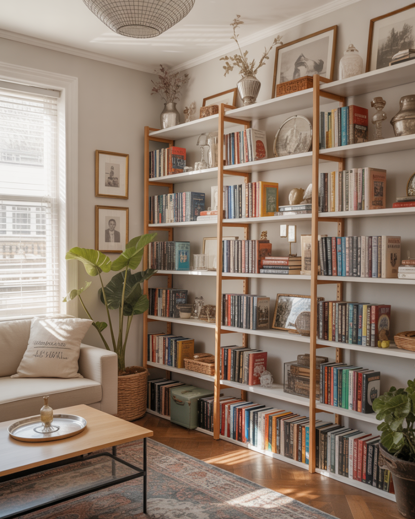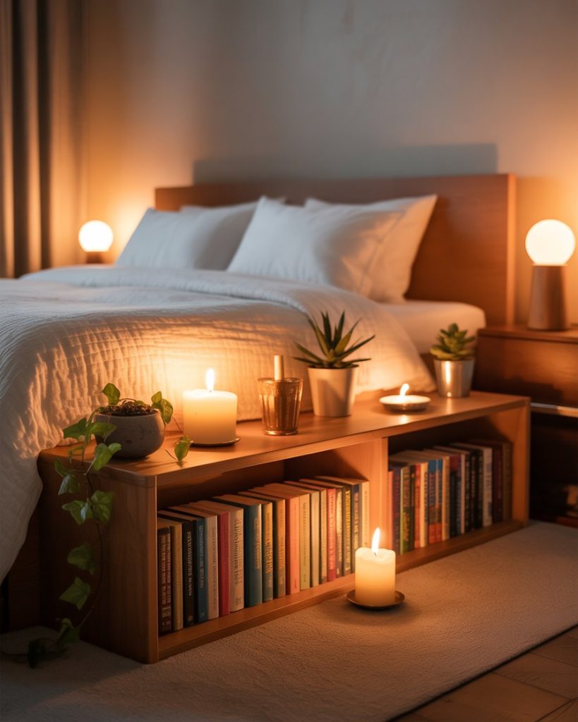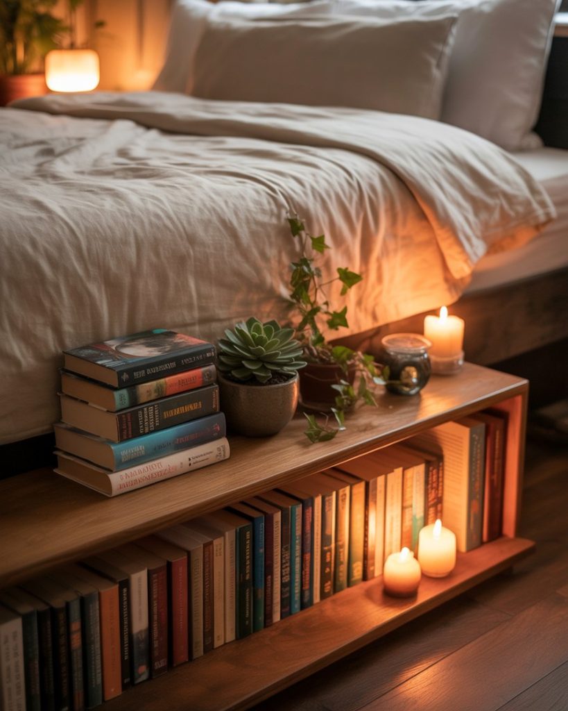 Transform bedrooms into soft reading retreats by adding low bookshelves at the foot of the bed or beneath windows. Mix novels with fabric boxes, candles, and plants for calm late-night browsing. Ideal for small homes where every zone must multitask.