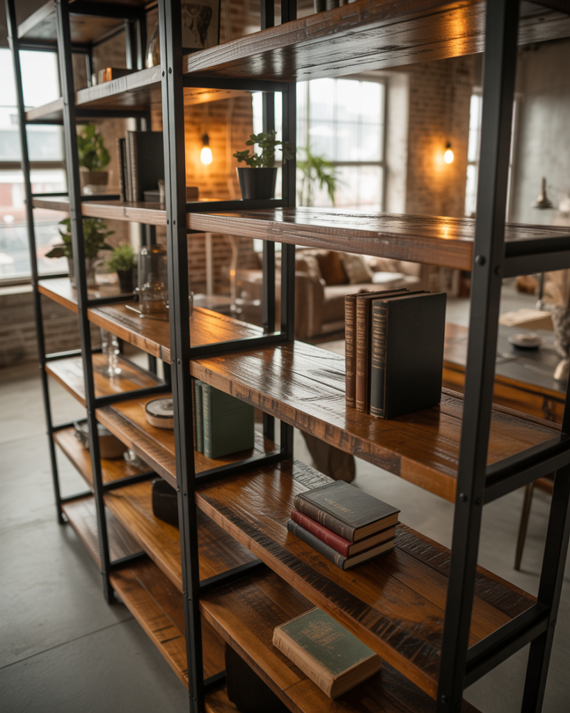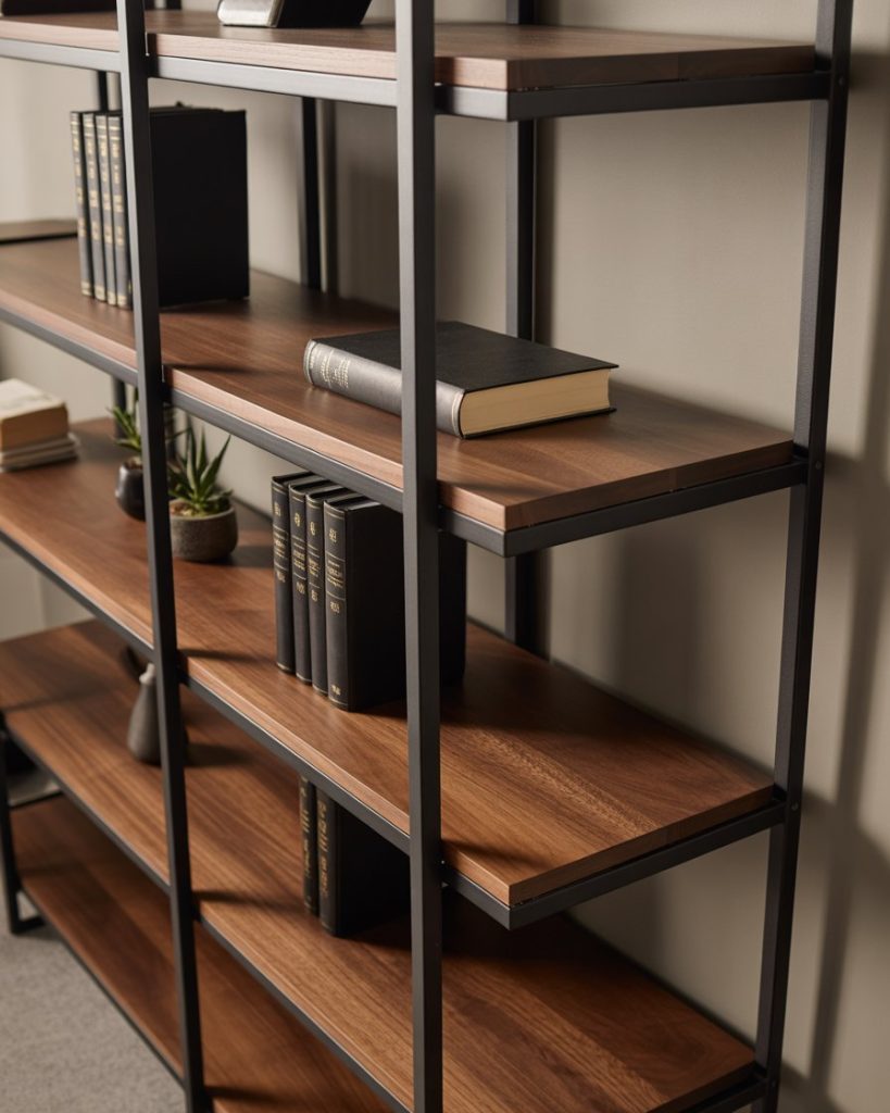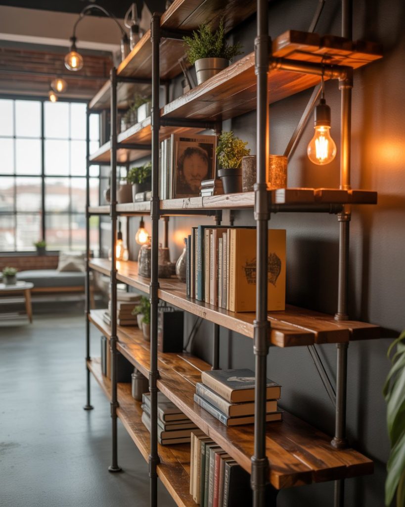 Finally, industrial bookshelves return with softer edges. Exposed bolts, dark metals, and reclaimed wood create strong contrast for modern lofts or workspaces. A touch of patina and Edison lighting completes this effortlessly elegant look.