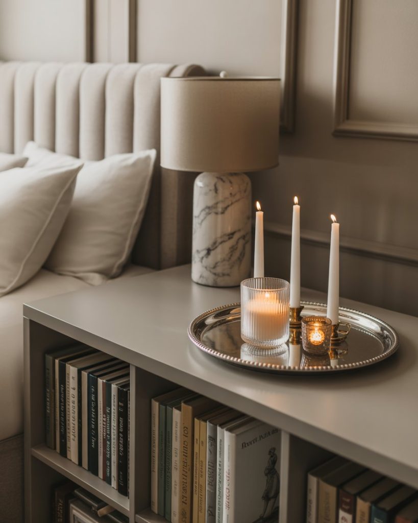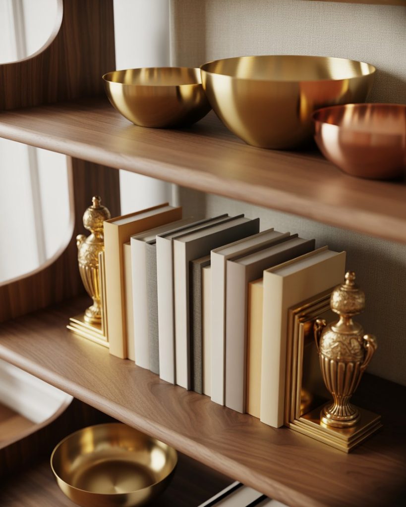 Metallic bookends, gold frames, and polished bowls add instant elegant shine to neutral shelves. Mix metals carefully—brass with bronze, chrome with nickel—to avoid clashes. Works in dining rooms and entryways where a hint of luxury makes an impression.