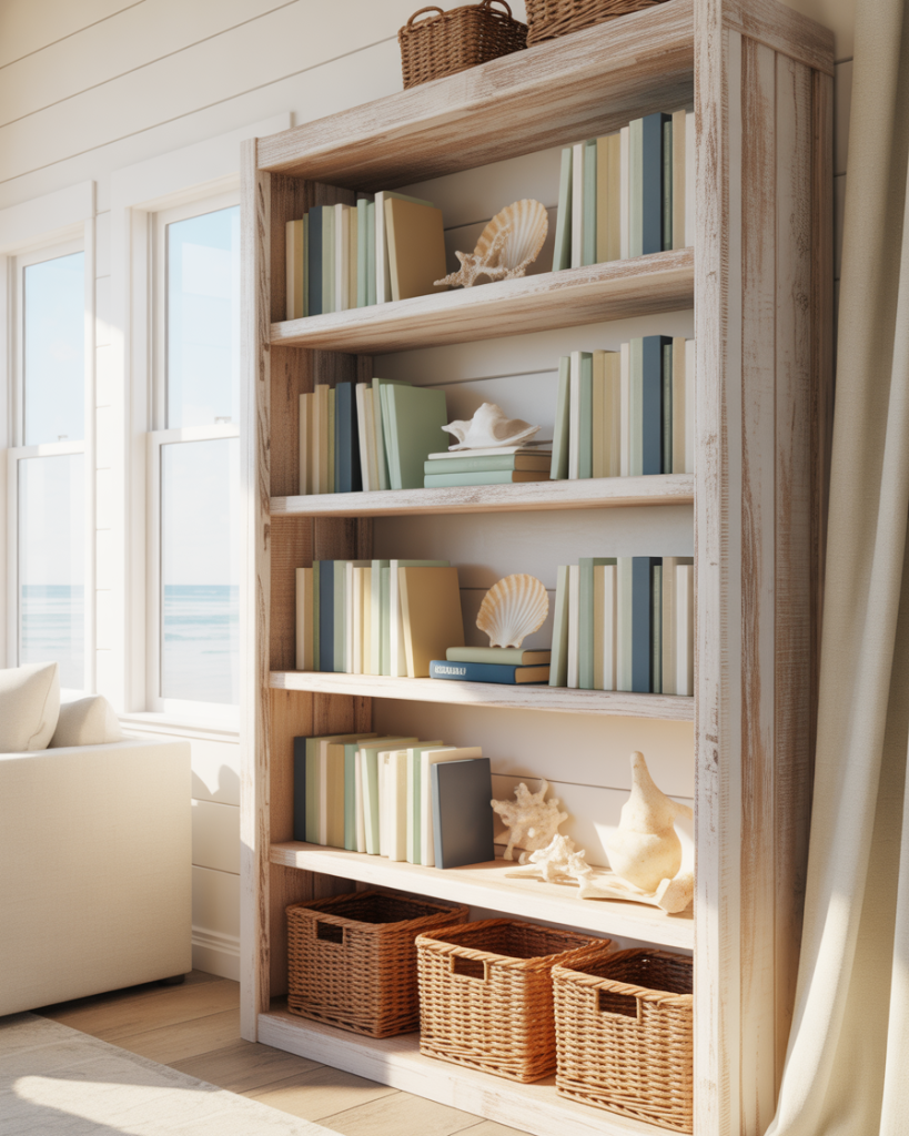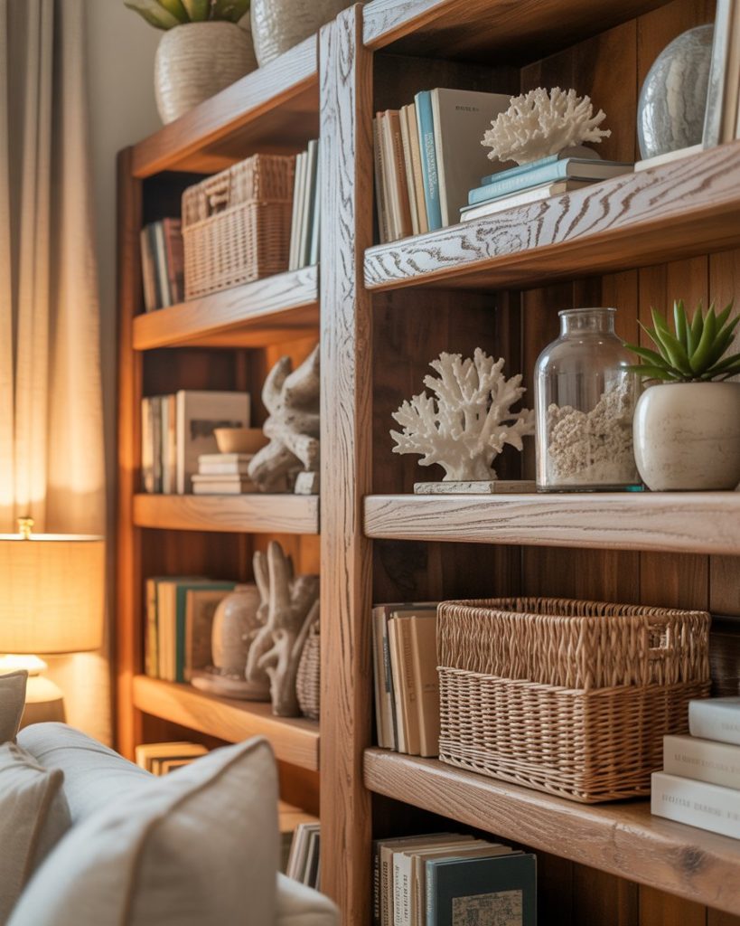 A coastal bookshelf is made of light woods with generous spacing, seashell accents, and books in ocean tones. It is perfect for a beach home or for those who want to bring in easy-going summer vibes. Pair with rattan baskets and linen fabrics to maintain a fresh and open feel.