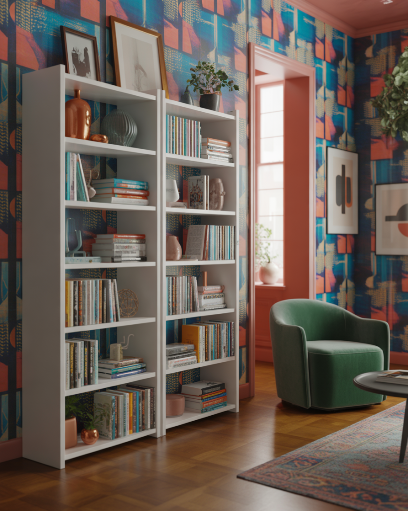 Adding wallpaper inside the back panel of a shelf instantly creates visual depth. Choose bold florals, geometric prints, or soft pastels depending on your theme. This trick works especially well in rentals, transforming even basic Ikea units into custom pieces.