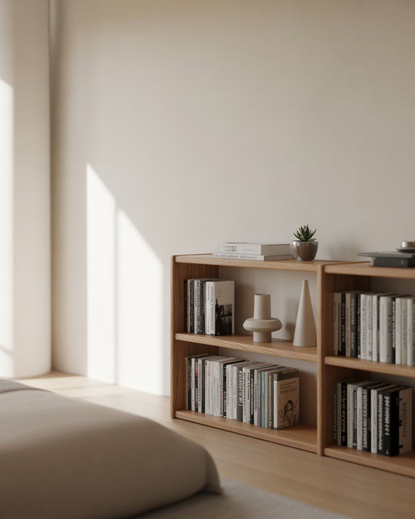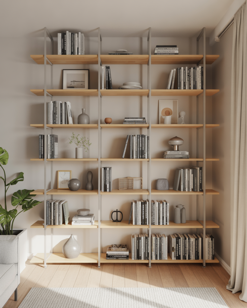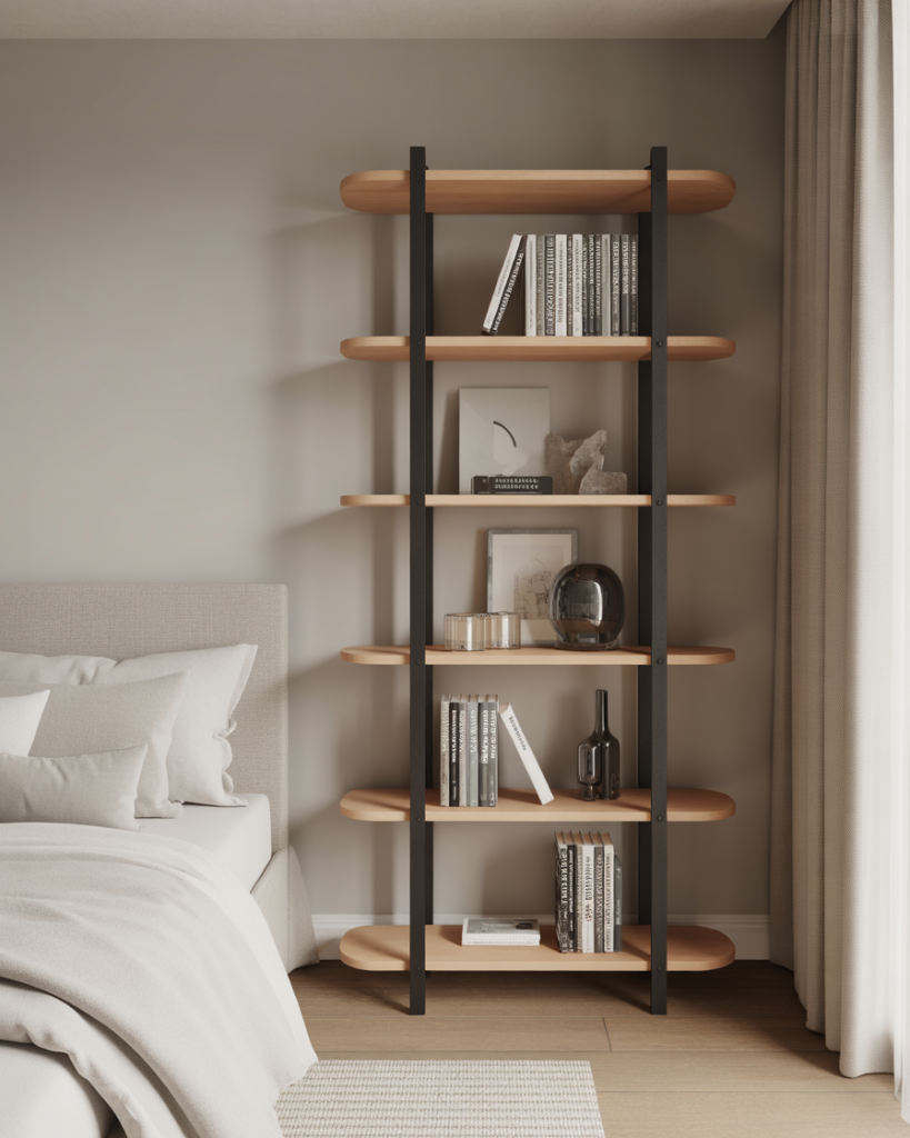 An open bookshelf can double as a room divider, perfect for studio apartments. Style both sides with books and décor that look good from every angle. This floating effect keeps spaces airy while still offering storage and personality.