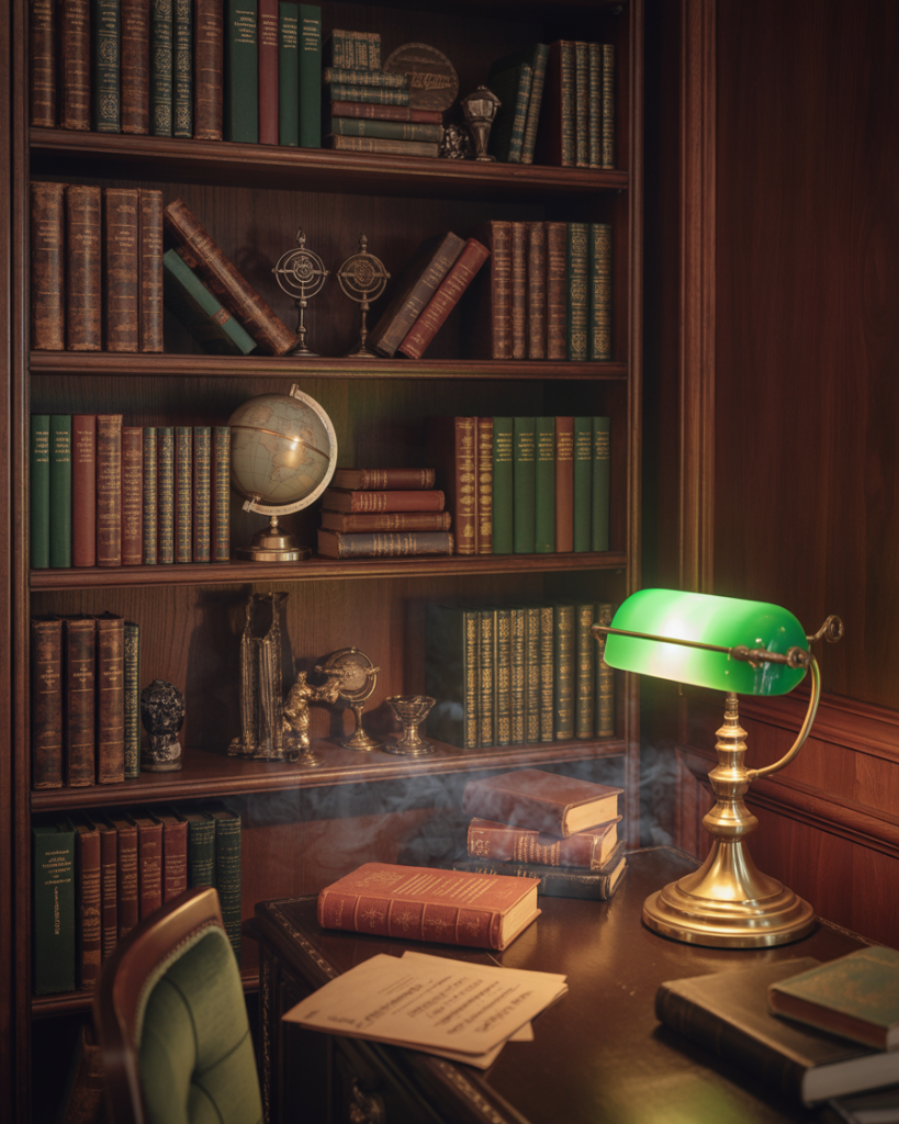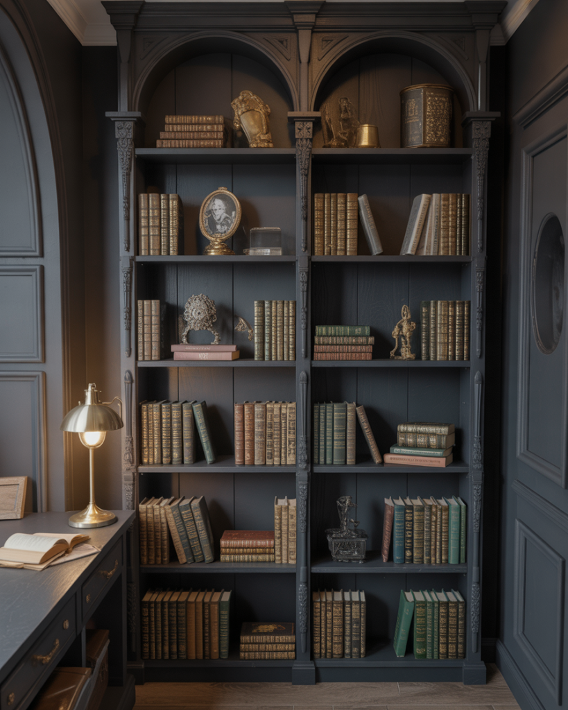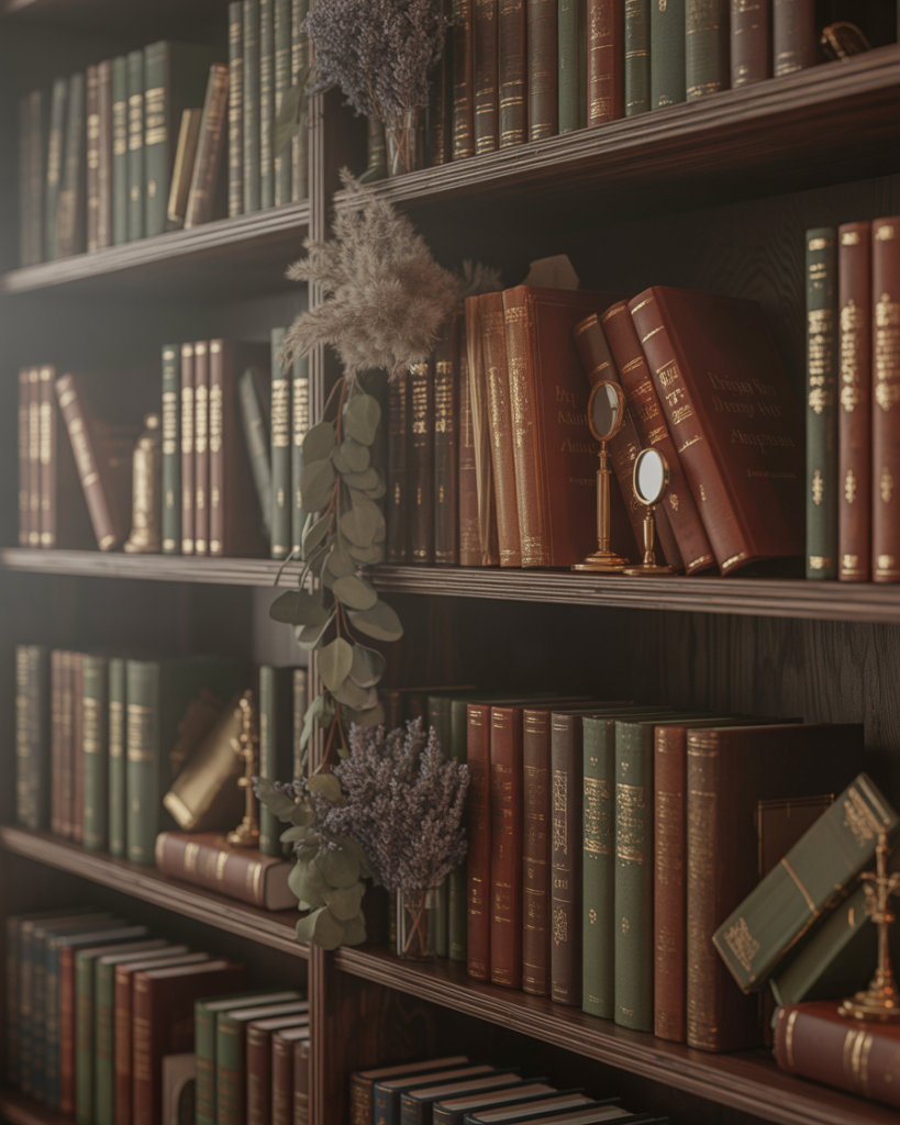 Channel dark academia decor with leather-bound books, brass magnifiers, dried flowers, and aged paper. Deep wood tones and moody lighting turn even a corner shelf into a poetic study nook. Think vintage Oxford meets rainy-day coffee shop.