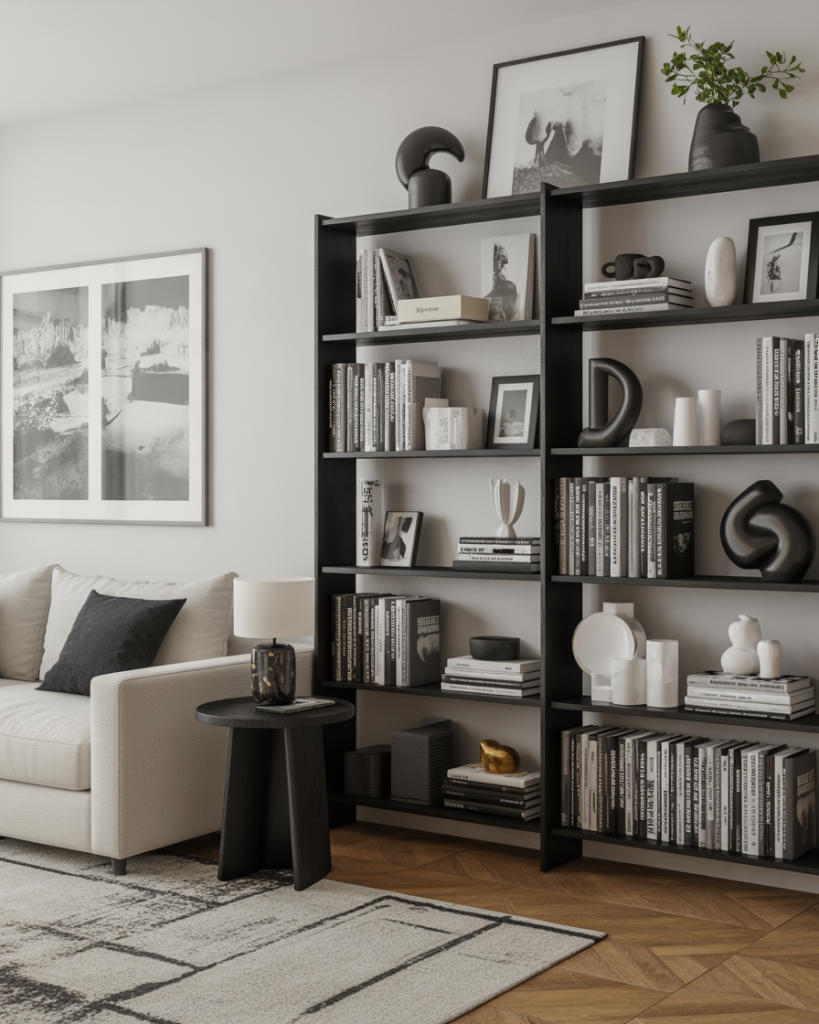 A strictly black and white palette feels graphic and refined. Use monochrome book jackets, ceramic objects, and framed prints for a gallery-like effect. Works especially well in modern or minimalist homes where contrast makes a quiet statement.