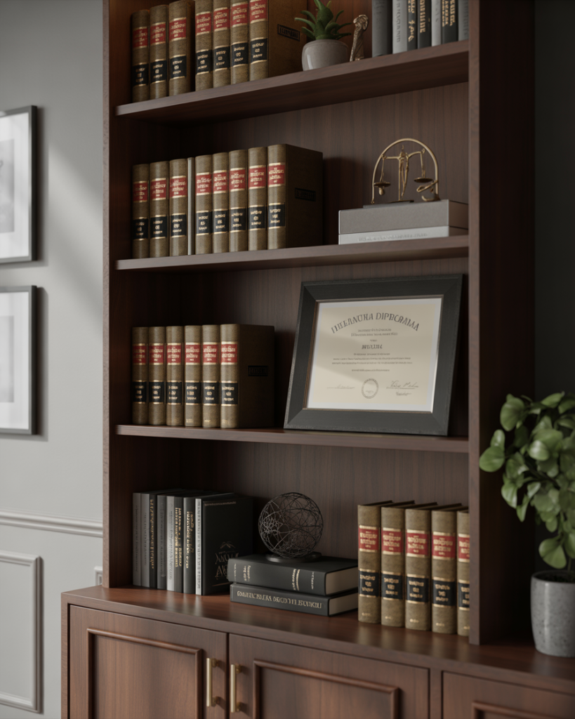 In a law office, bookshelves balance professionalism and personality. Leather volumes, framed degrees, and subtle art pieces create trust. Add a single plant or sculpture for warmth without losing authority—formality doesn’t mean lifeless.