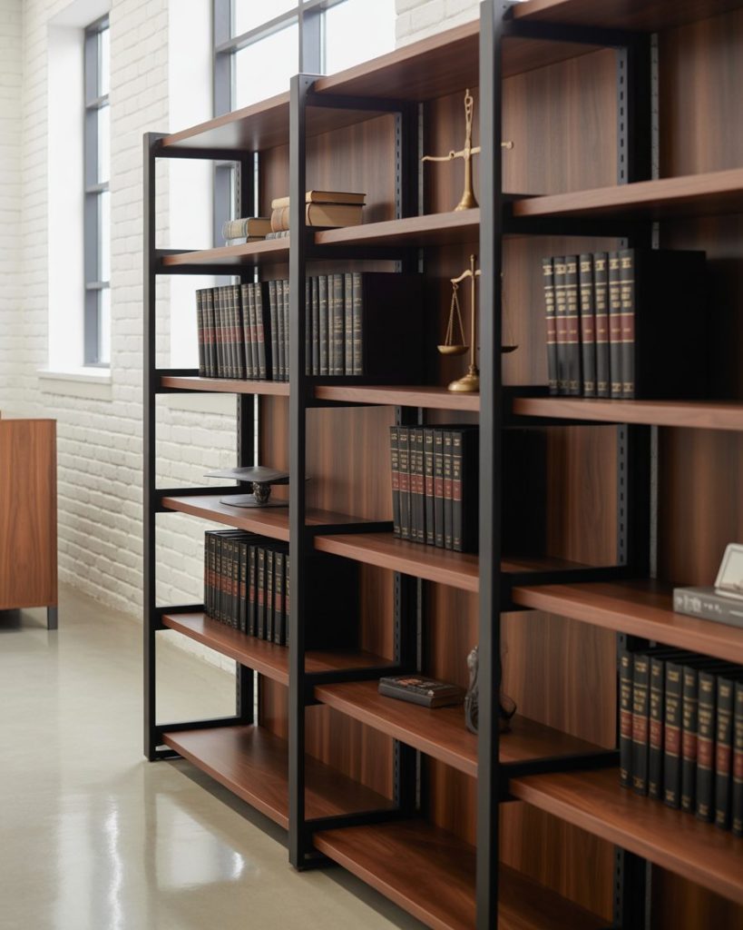 A modern shelf design celebrates geometry. Symmetrical cubes or open metal frames add sleekness to a law office or studio. Try industrial materials like steel paired with walnut shelves for contrast. Add small plants or sculptures to humanize the structure—balance is key.