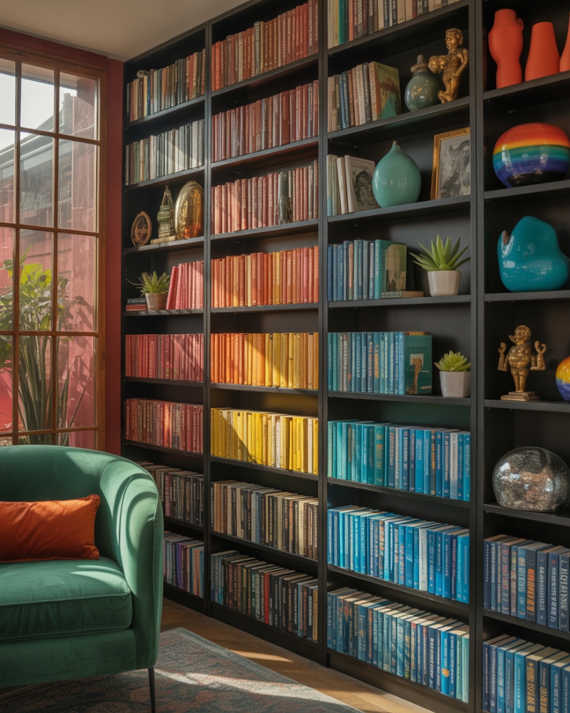 Nothing enlivens a space like a colorful display. Organize books by hue for a rainbow effect or mix bold ceramics and patterned boxes. Designers at House Beautiful note that a touch of saturation boosts mood and creativity, especially in small living rooms or offices.