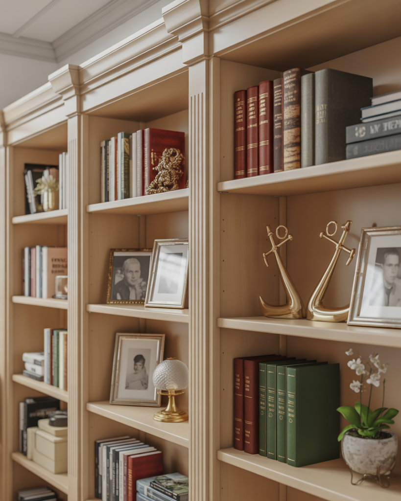 For those drawn to timeless neatness, the preppy approach works wonders. Blend Ikea shelving with custom trim and display leather-bound books, framed photos, and monogrammed trinkets. The look suits studies and law offices, offering polished sophistication with personal warmth.