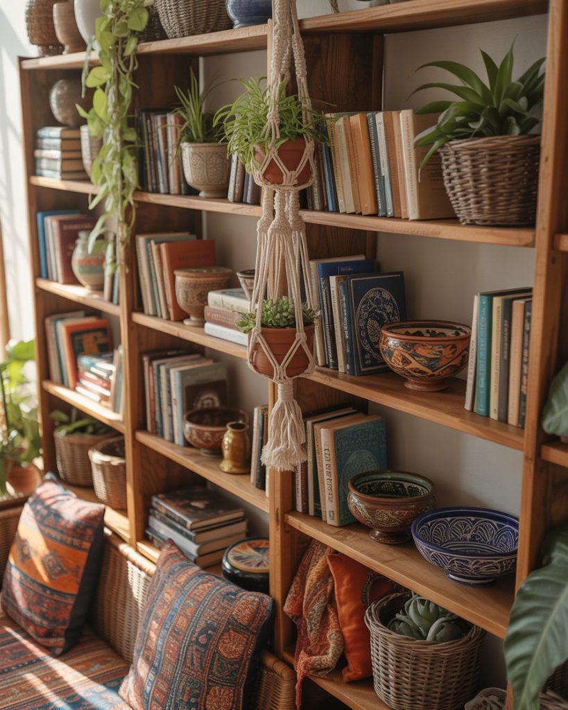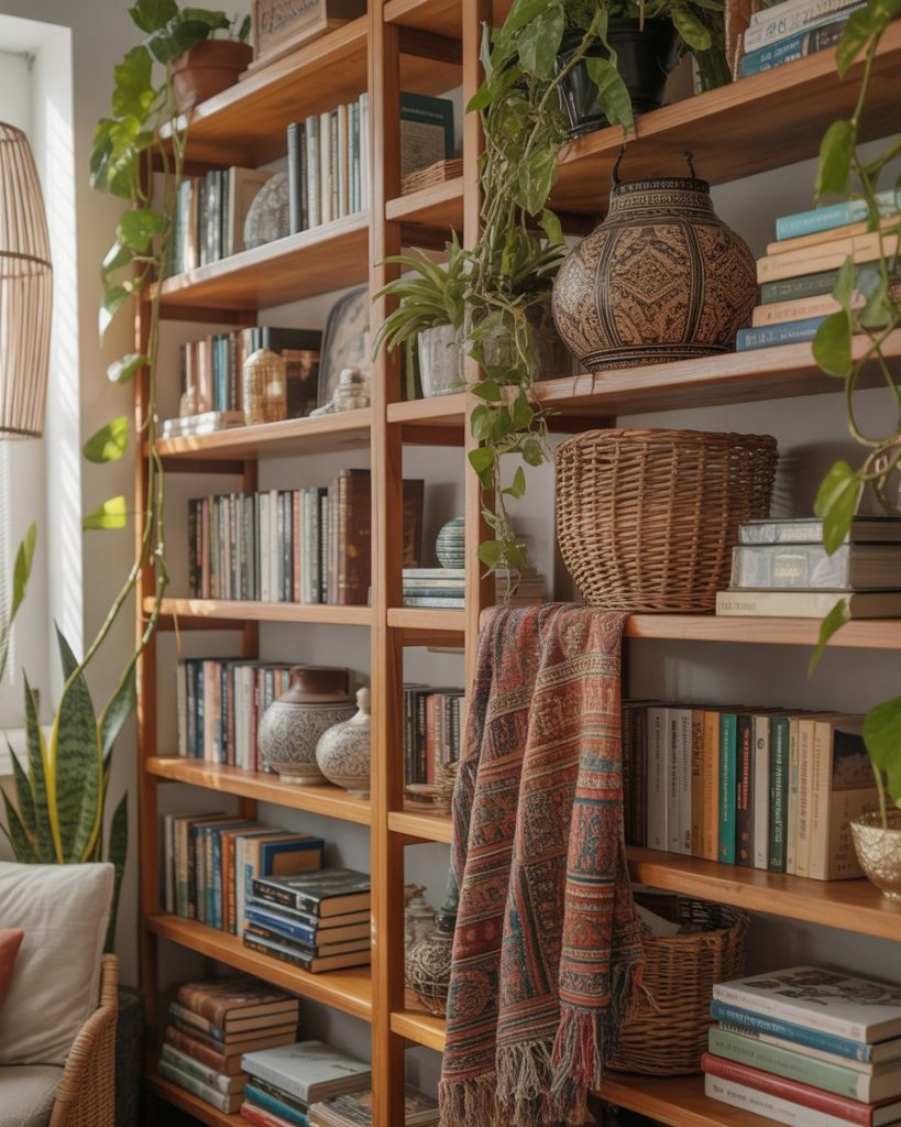 The bohemian, or boho, bookshelf mixes textures and global accents. Layer woven baskets, patterned textiles, and ceramics collected on travels. Add plants for life and movement—a nod to designer Justina Blakeney’s signature style. It feels spontaneous yet deeply curated.