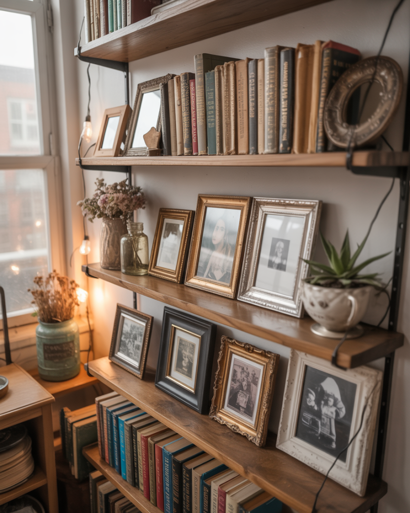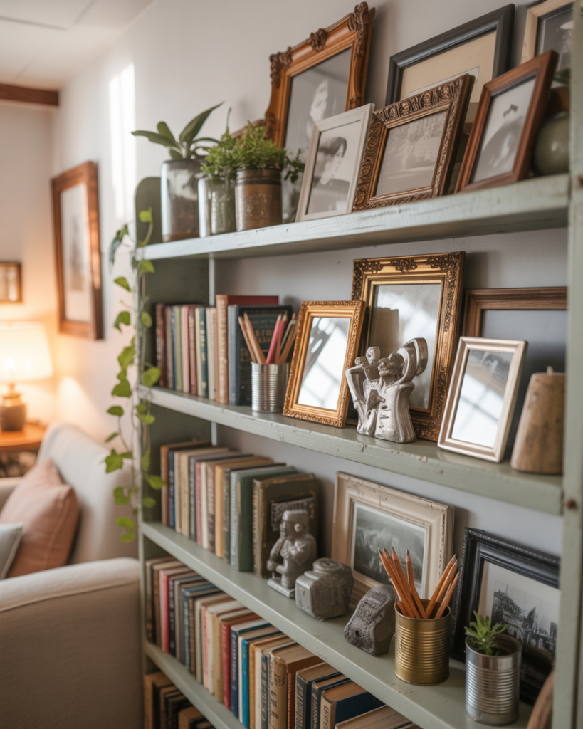 A thrifted shelf tells stories of discovery. Mix mismatched frames, ceramics, and rescued novels from flea markets. The result feels creative and intimate—like a home with history. Perfect for renters or first apartments where budget meets imagination.