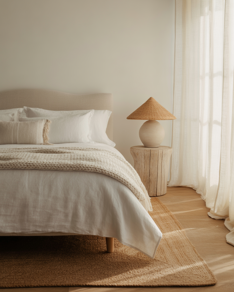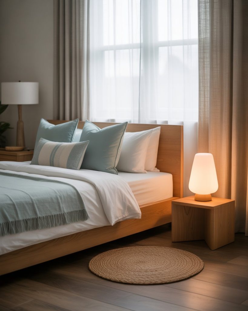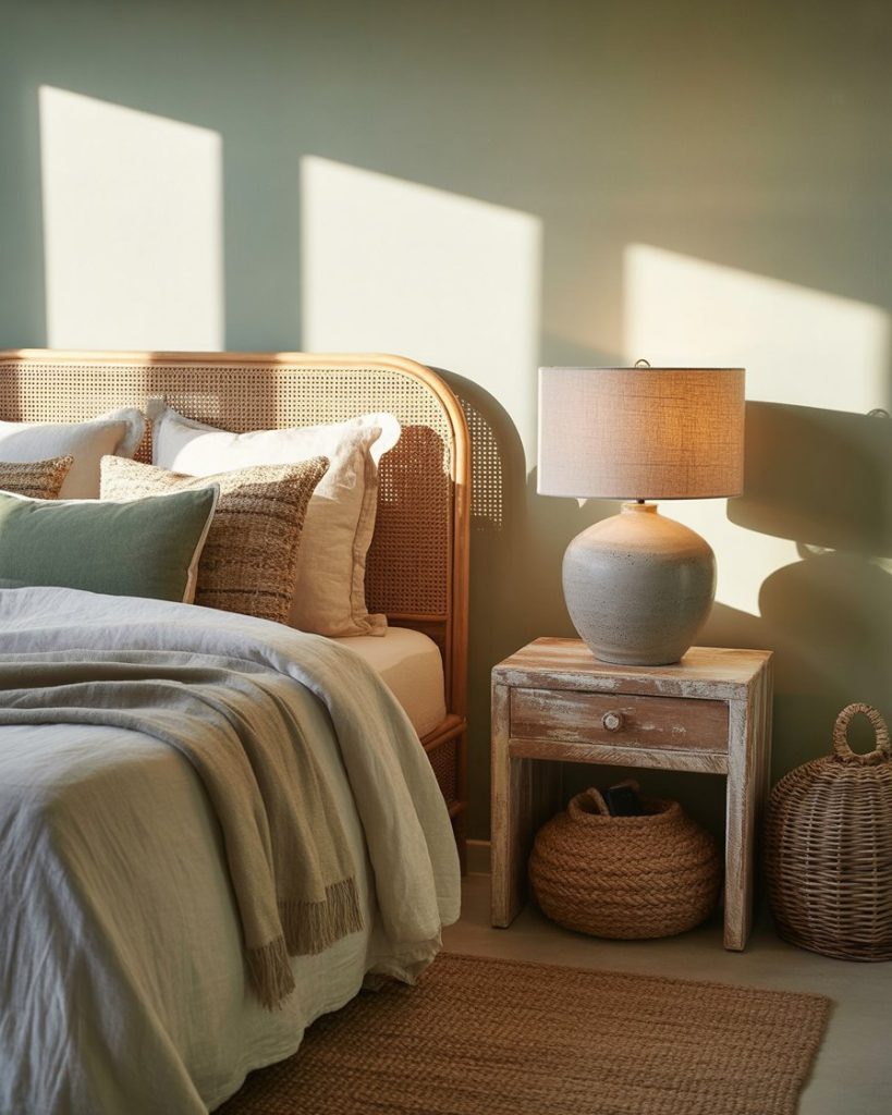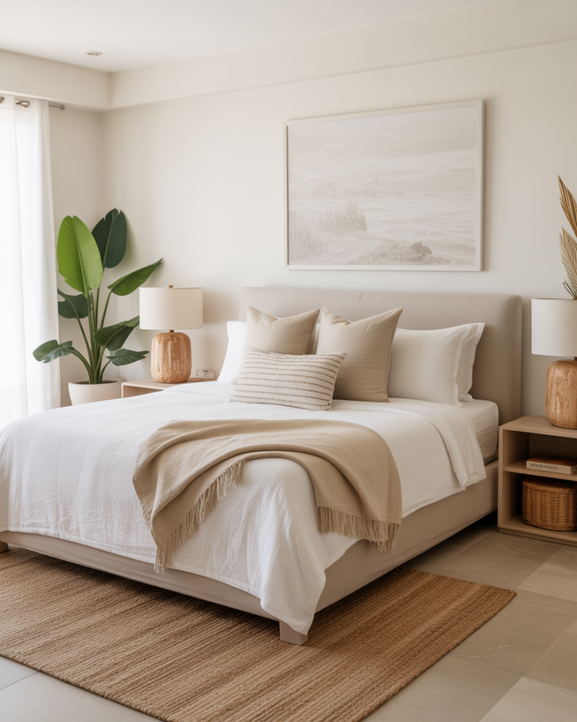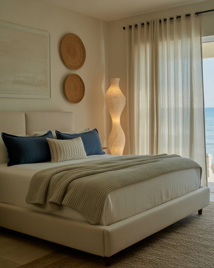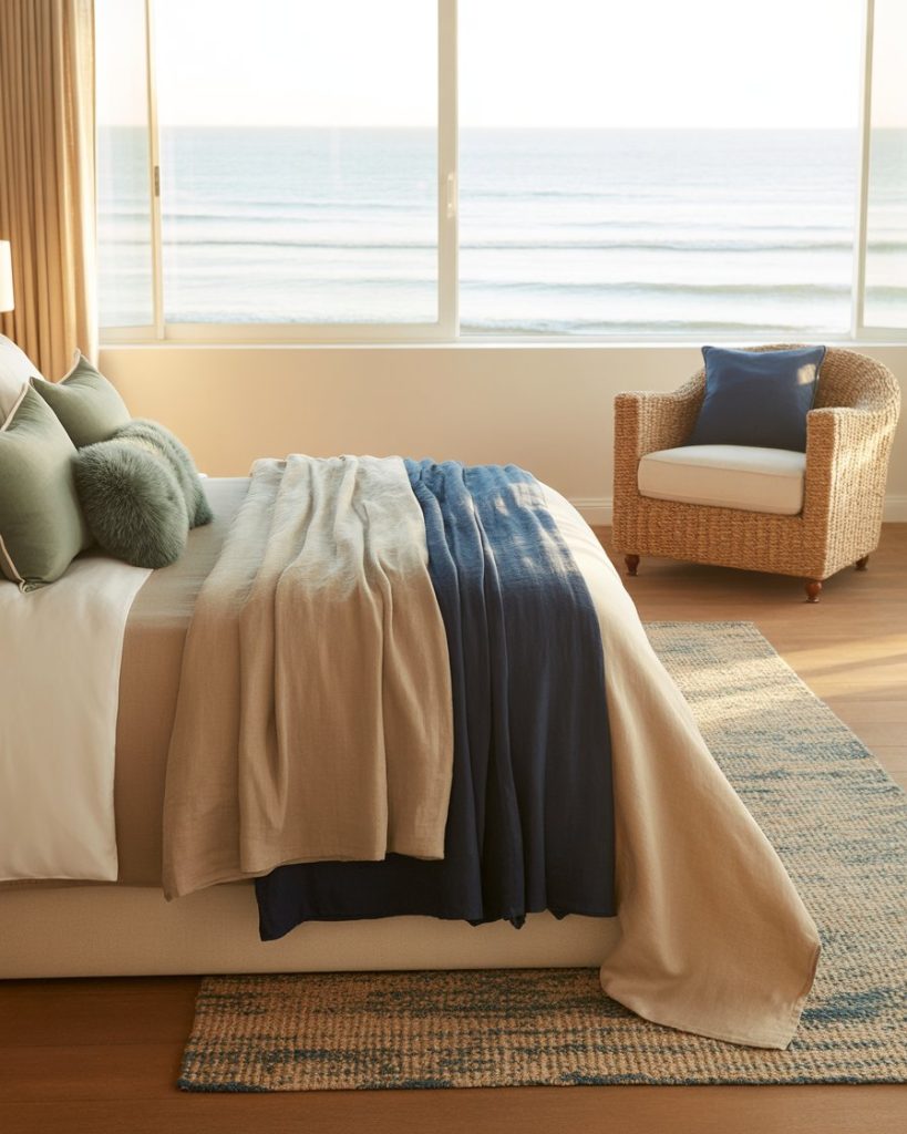 Instead of relying only on whites and blues, try adding warm clay and terracotta shades. These earthy hues pair beautifully with woven textures and driftwood. Accent the room with green plants for balance. This look transforms a master suite into a grounding sanctuary that feels natural yet elevated.