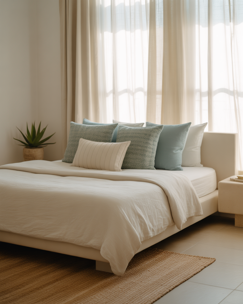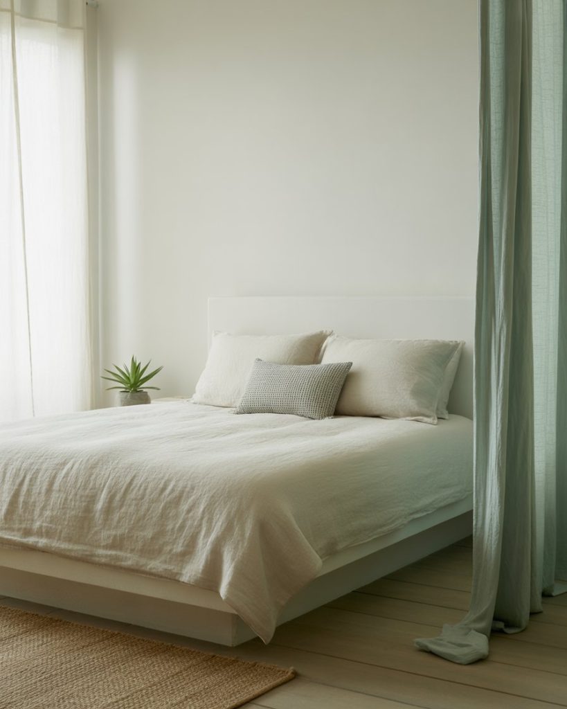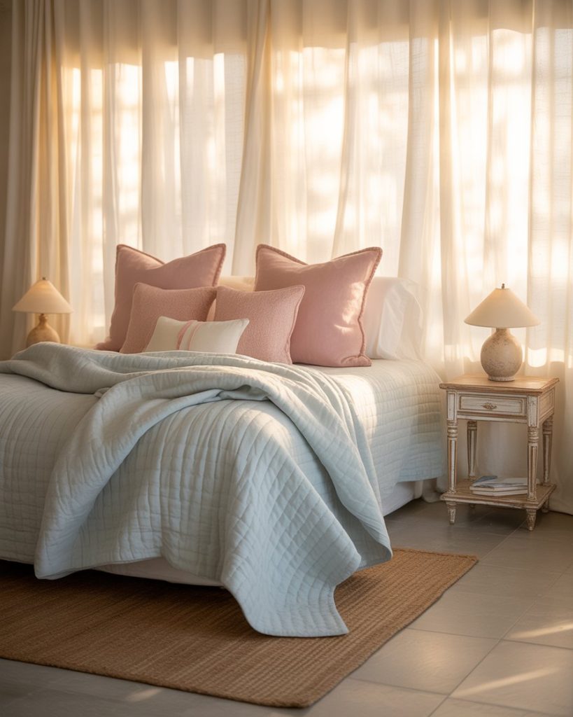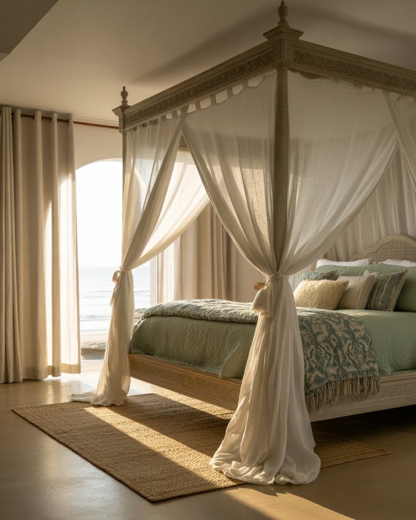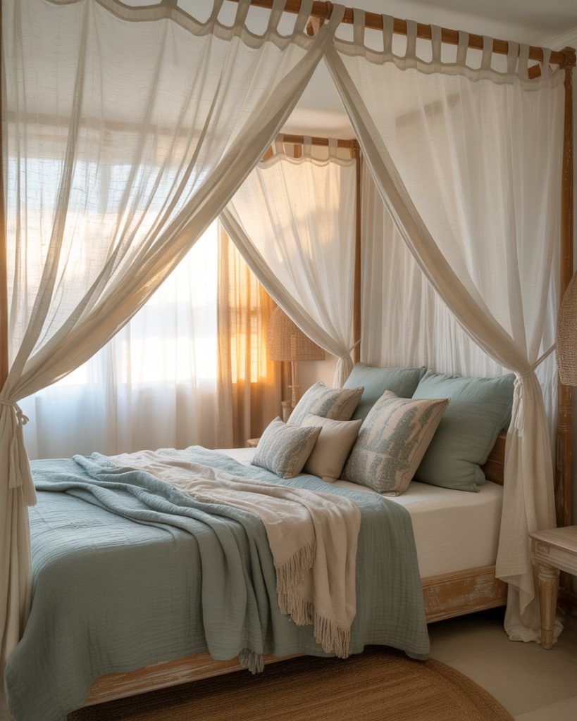 A canopy bed creates instant luxury, especially in a seaside setting. Pairing breezy white drapes with boho cushions and sage green and blue bedding gives the room resort-like appeal. This idea works beautifully for larger master suites, bringing both romance and serenity into the bedroom.