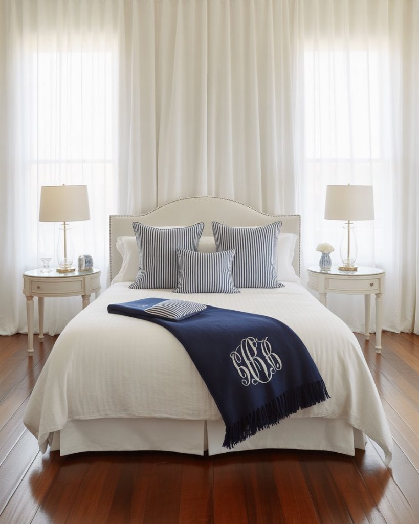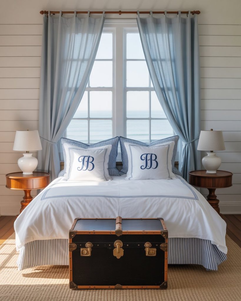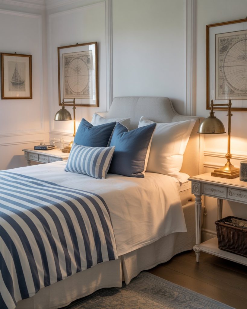 Stripes never go out of style in coastal bedrooms. Use them boldly on bedding, rugs, or curtains in navy and white for a preppy finish. Add brass fixtures and framed maps for subtle sophistication. This classic design works equally well in family homes and small rooms where stripes visually expand the space.