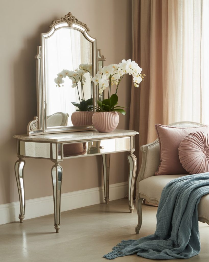 Adding mirrored furniture and glossy finishes gives coastal bedrooms a glamorous edge. Pair neutral walls with mirrored nightstands, pink throws, and blue accessories for balance. This mix of coastal softness with a hint of shine is ideal for those who want a modern and slightly elevated style.