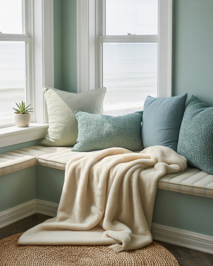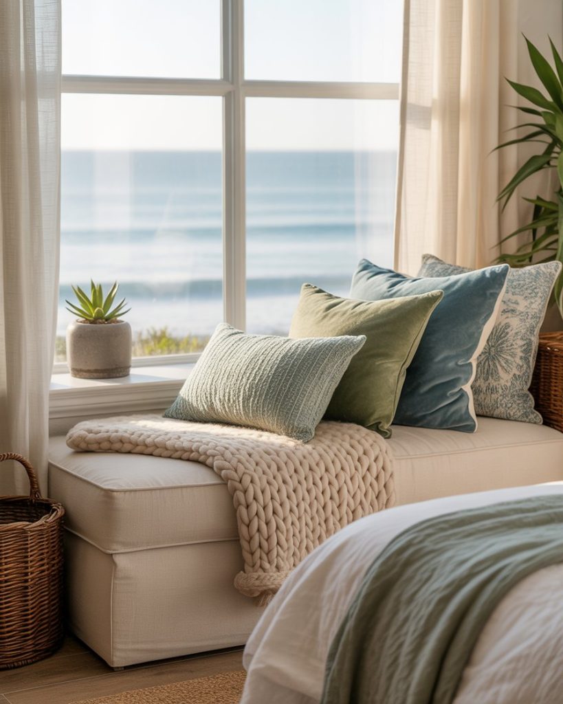 Incorporating a reading nook into your bedroom makes the space more personal. Add a built-in bench by a window, layered with cozy textiles and bohemian pillows in green and blue shades. This creates a relaxing corner where you can enjoy natural light and unwind by the sea.