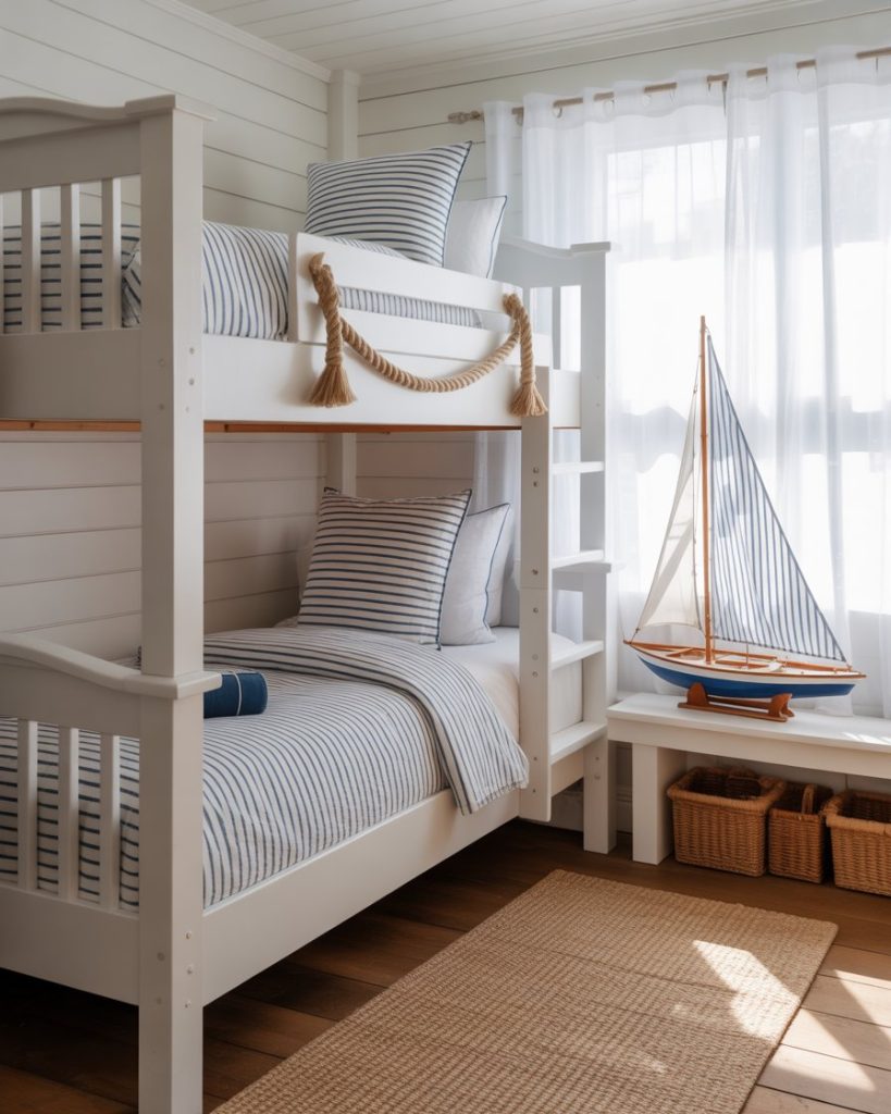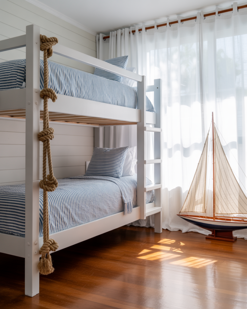 For families or guest rooms, coastal bunk beds are both practical and stylish. Painted in white or blue, they create a preppy and cheerful look. Add striped bedding and nautical rope details for charm. This idea is especially effective in small rooms, maximizing space without losing style.