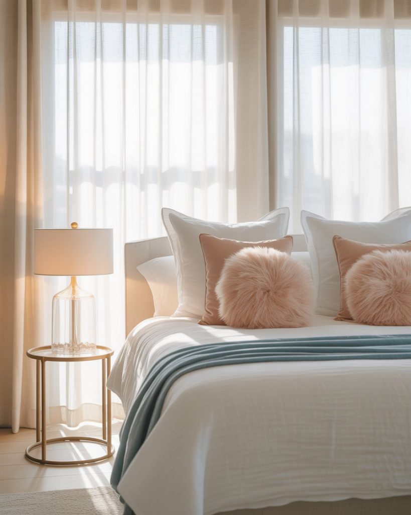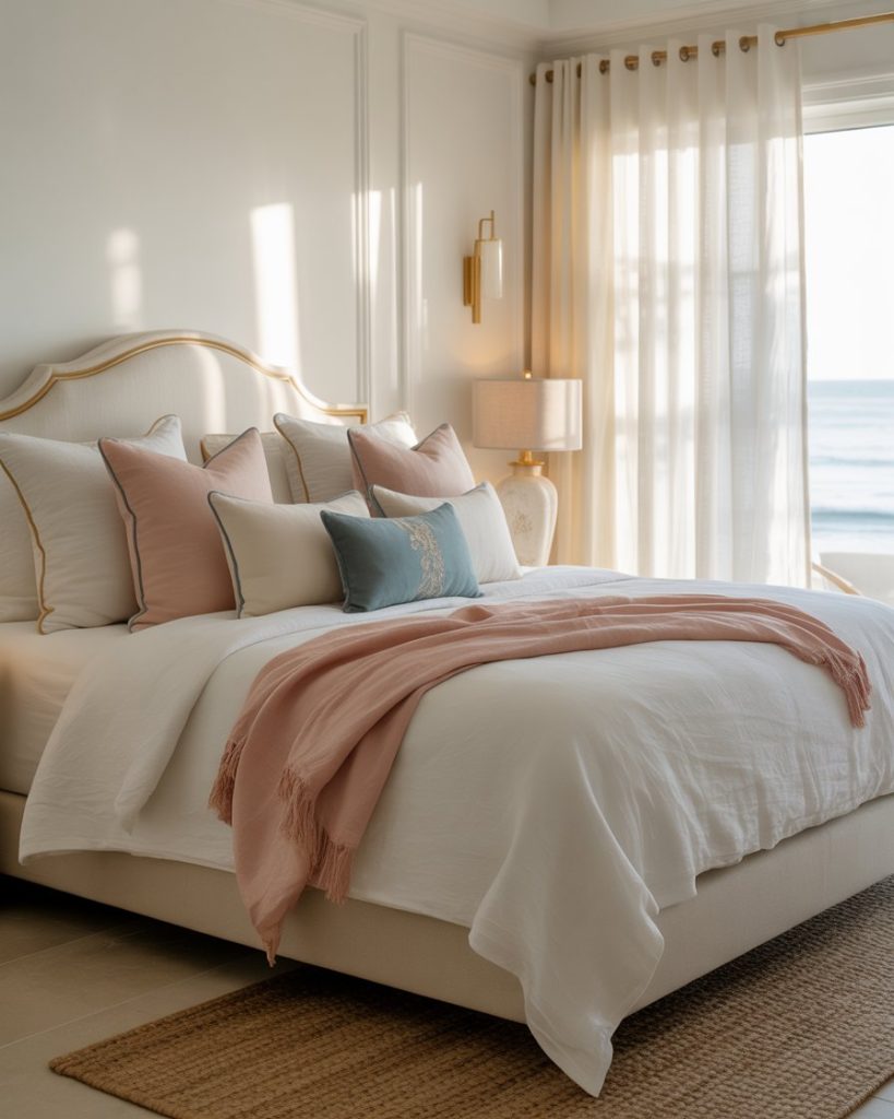 In 2026, adding pink is redefining coastal bedrooms. Whether it’s blush walls or pink and blue pillows, the palette adds warmth and makes the space more cozy. This look is especially helpful in small rooms, where it softens corners and creates a welcoming retreat. Designers like Domino spotlight this as one of the most playful trends of the year.