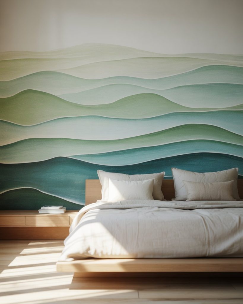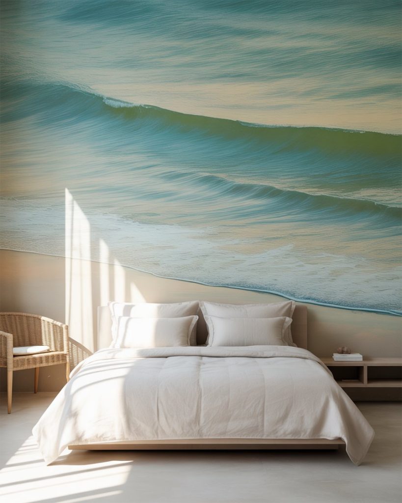 A statement wall mural can instantly transport you to the beach. Choose designs in sage green and blue or watercolor-like blue waves. Pair with simple minimalist furniture and neutral linens to let the mural shine. This is a creative idea for renters since peel-and-stick options are easy to update.