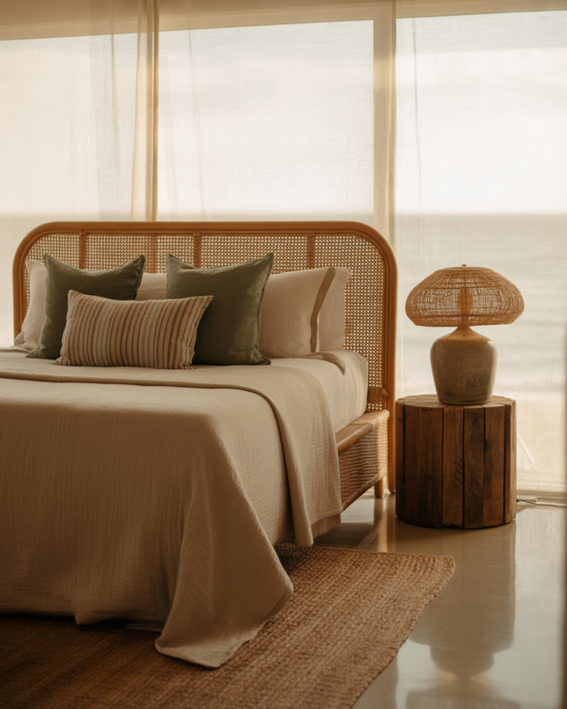 A rustic coastal style brings a sense of depth and authenticity through reclaimed wood, raw textiles, and earthy tones. Adding soft green accents in bedding or art ties the space to nature while maintaining comfort. This look fits beautifully in a master suite, where natural textures create the feeling of a seaside retreat layered with character.