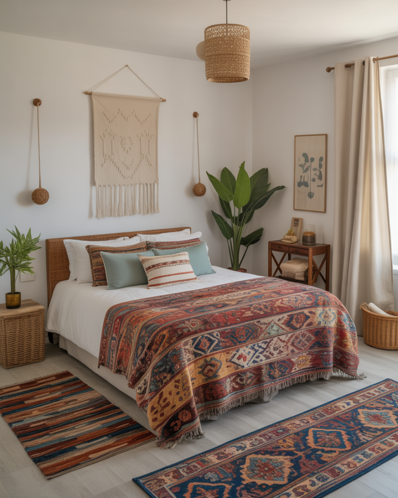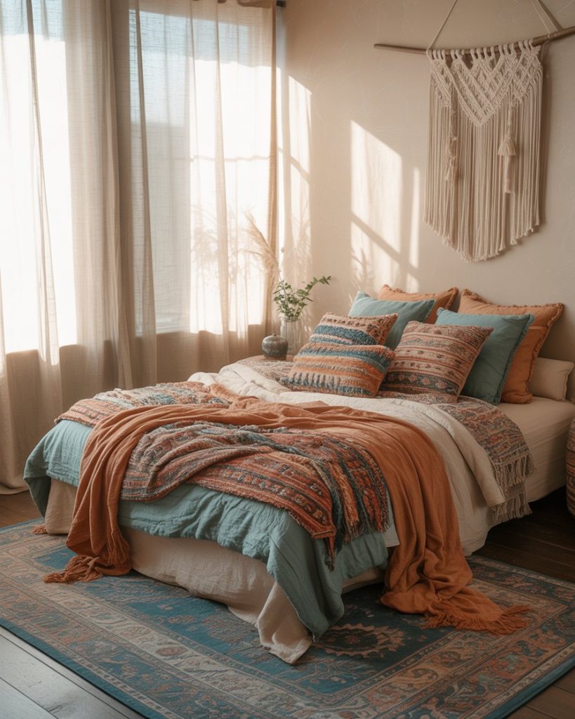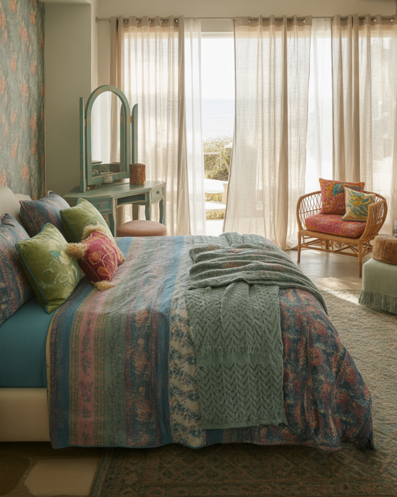 A bohemian coastal bedroom embraces layered textures, patterned rugs, and colorful textiles. Pairing blue and green hues with rattan or wicker furniture keeps the aesthetic tied to the ocean while feeling creative and relaxed. This approach suits small rooms well, as vibrant fabrics and eclectic details bring life without overcrowding.