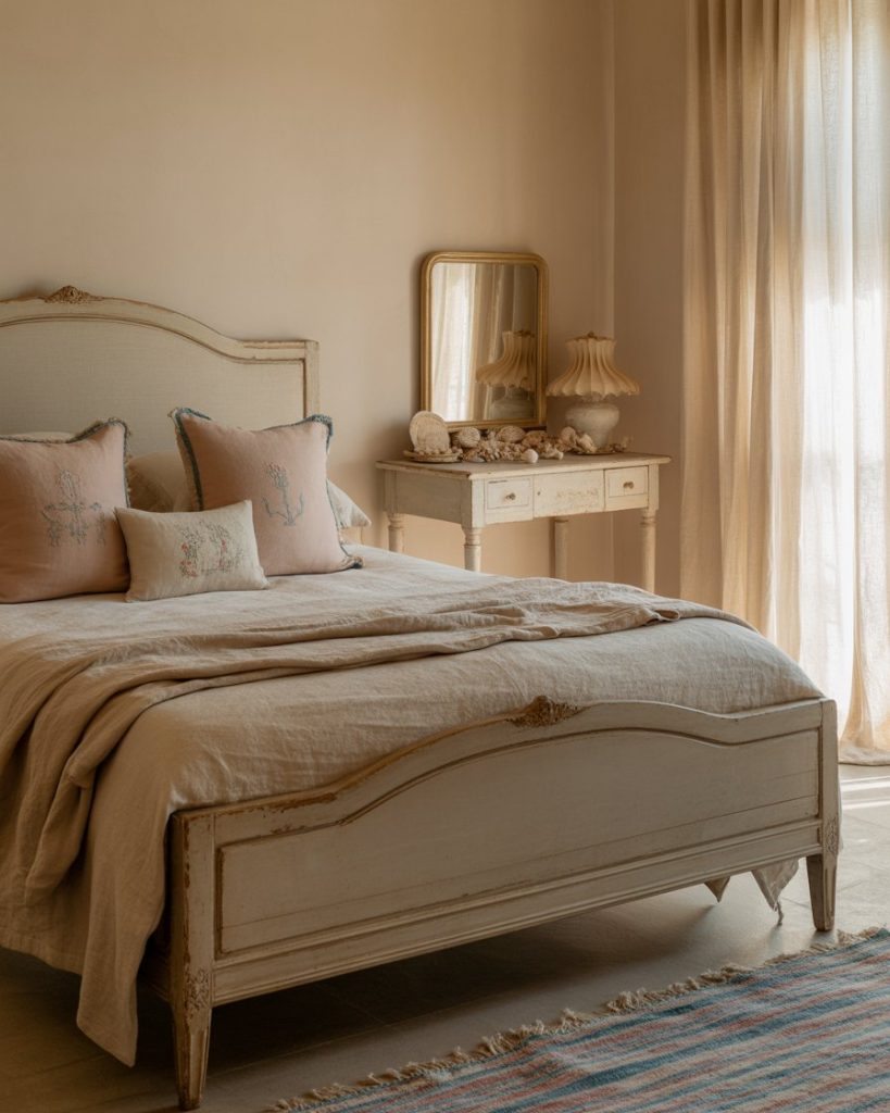 Infuse a sense of story into your coastal bedroom with vintage finds. An antique dresser, distressed nightstand, or master suite color palettes beige bedding can anchor the look. Adding pink and blue textiles gives a cheerful lift while maintaining nostalgia. This style makes your bedroom feel timeless, as if collected through generations.