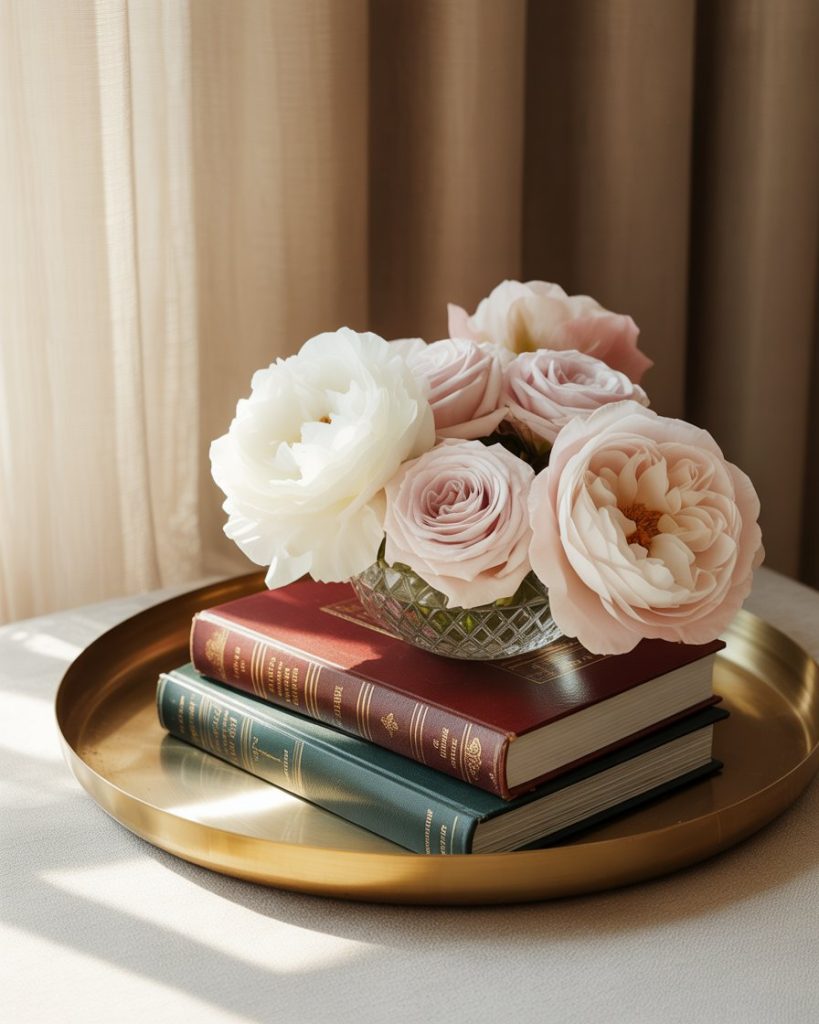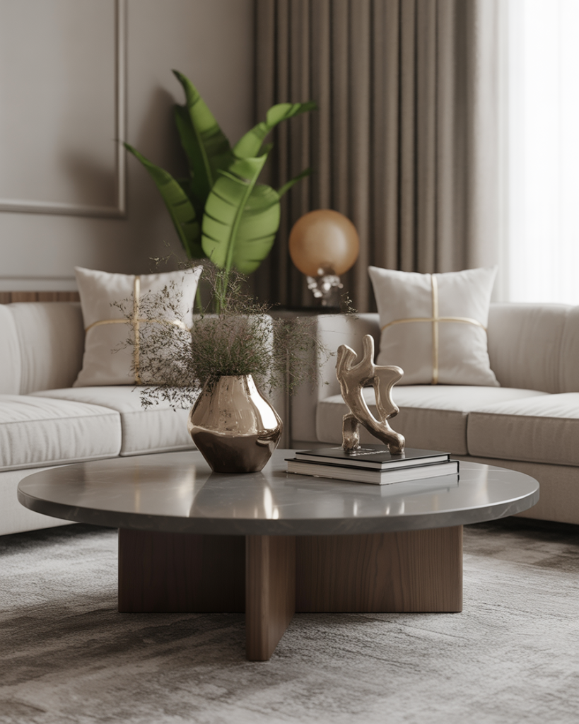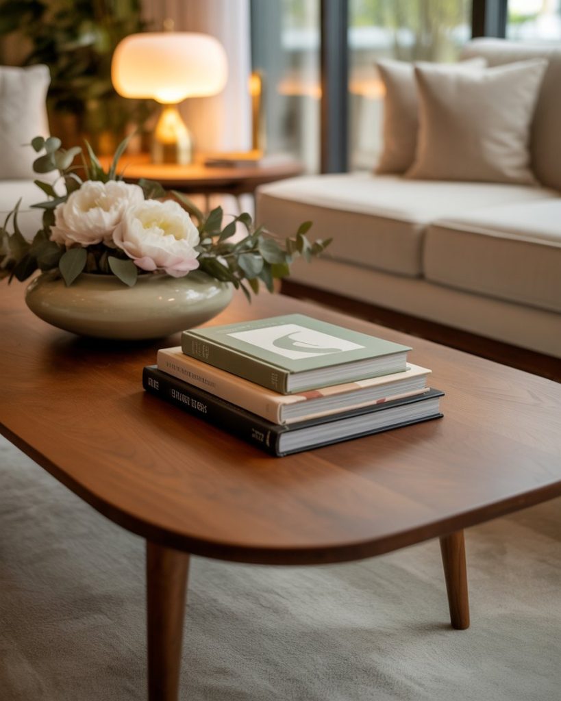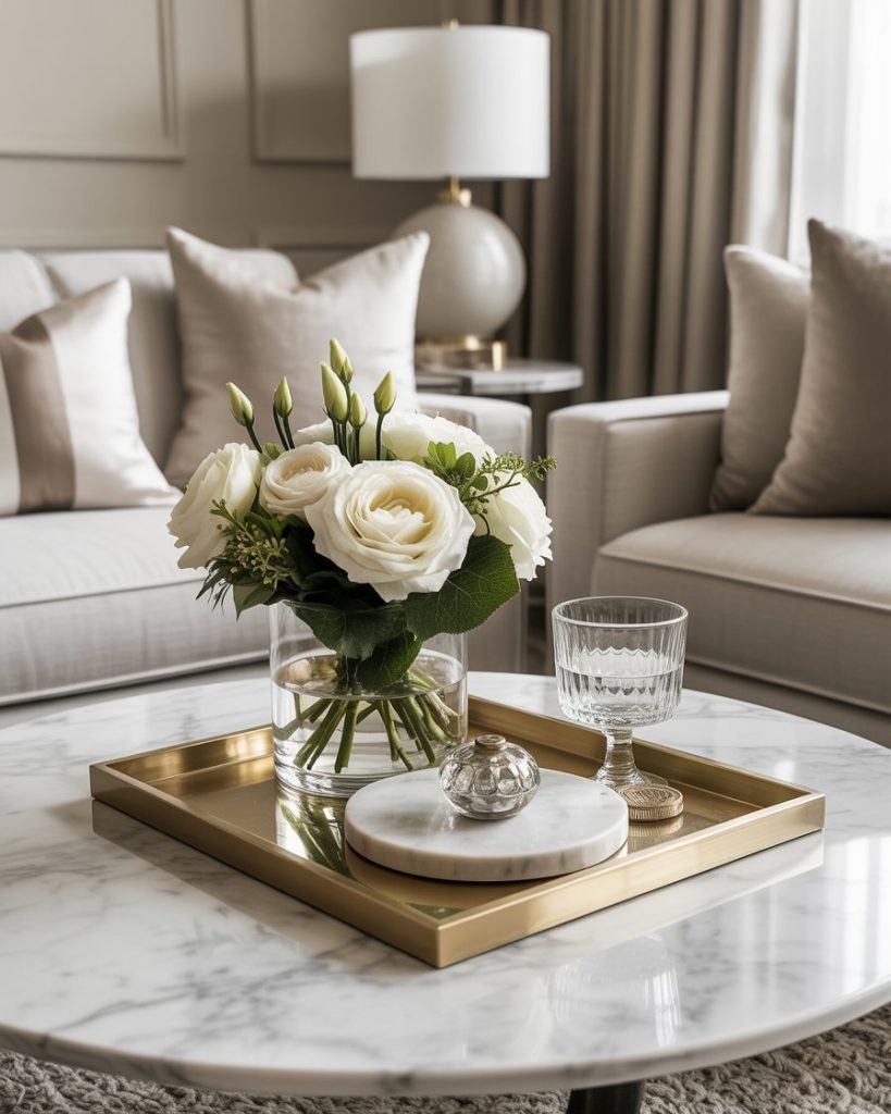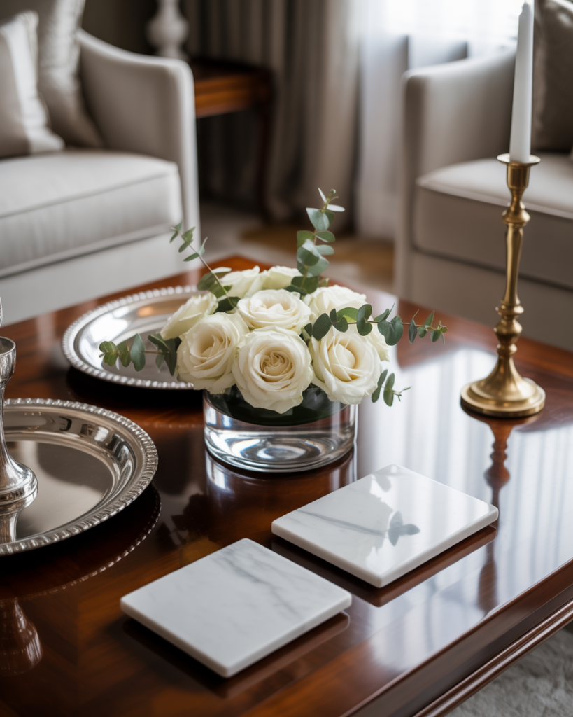 A classic coffee table style relies on symmetry, polished trays, and timeless materials. Marble coasters, a small floral arrangement, and neatly arranged books give the living room a clean, elegant feel. This is perfect for people who prefer order and calm over experimentation, inspired by traditional American interiors.