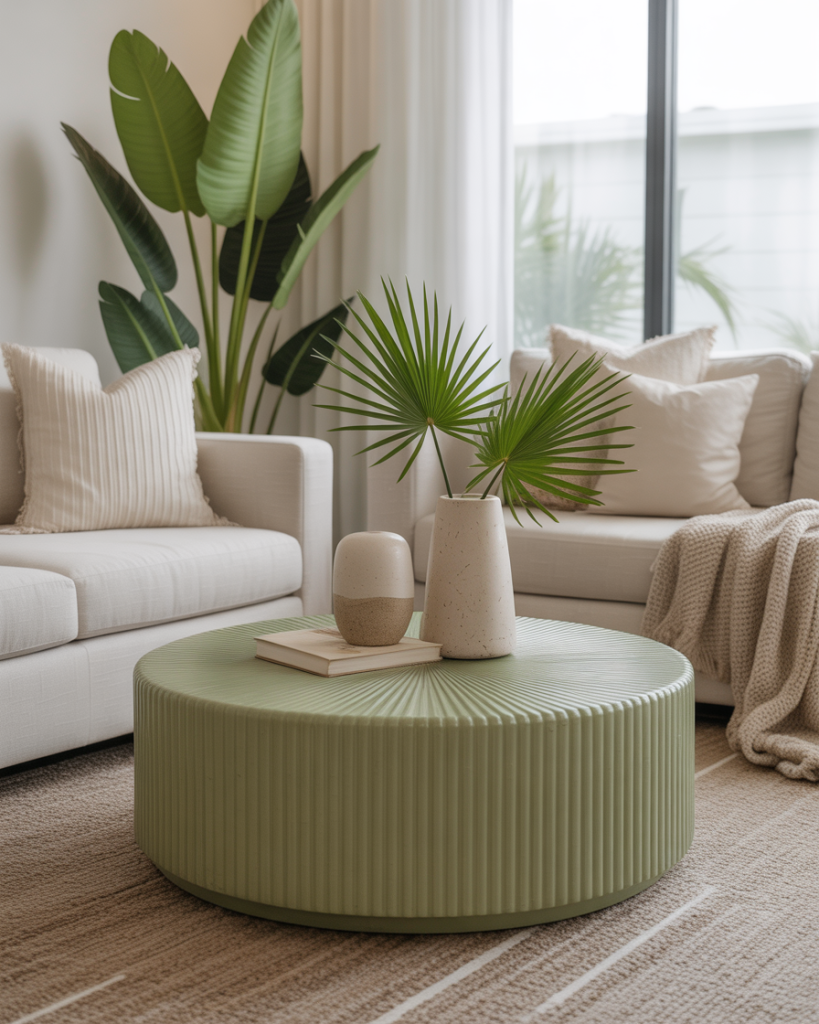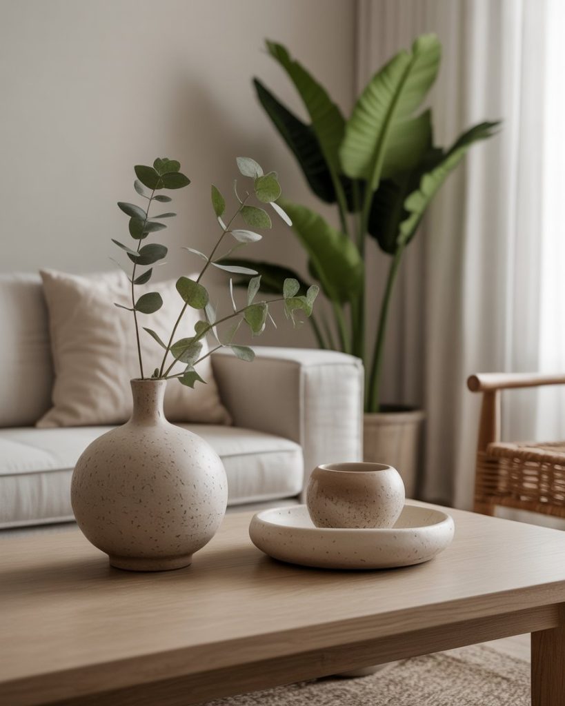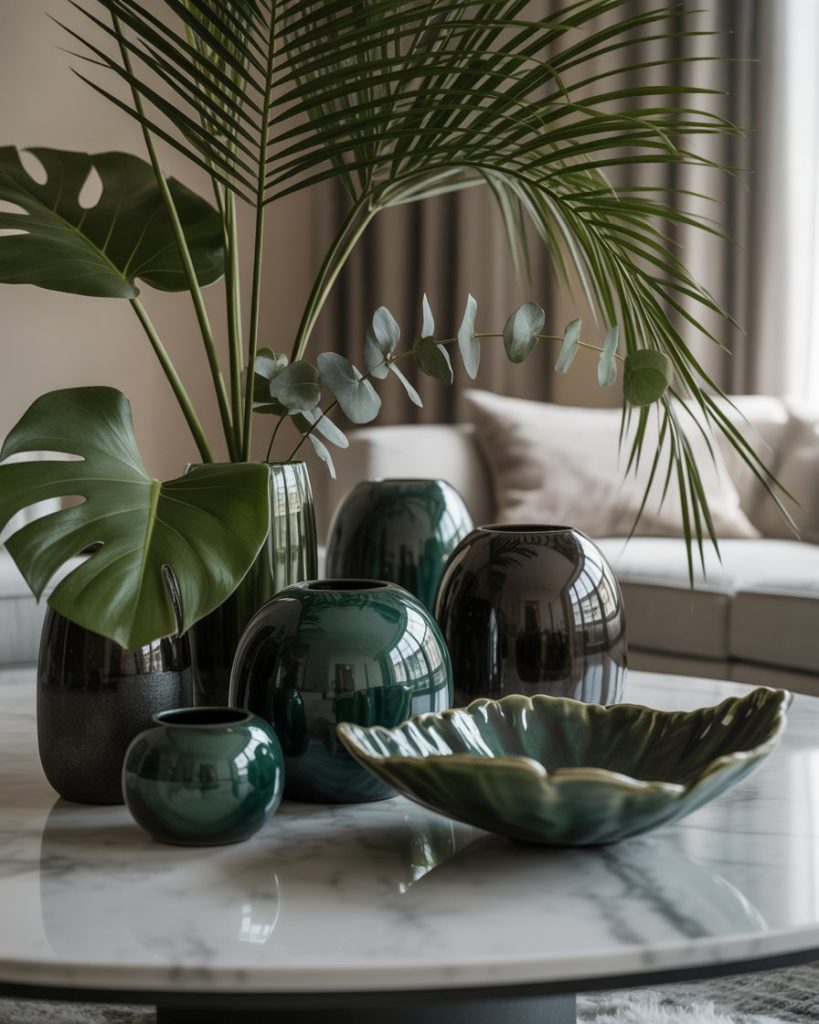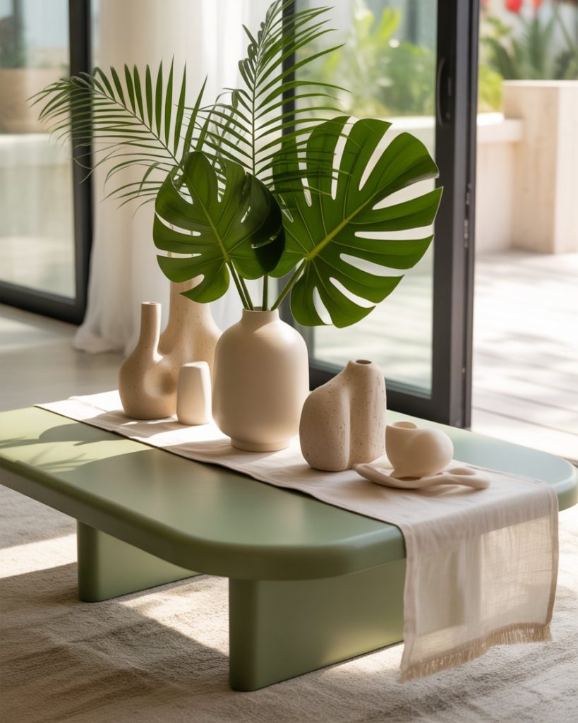 Adding tropical greenery like a monstera leaf or small palm instantly freshens the coffee table, especially when combined with neutral ceramics. This style is great for warm climates or homes that need an uplifting natural touch. The contrast between green and soft tones creates a lively but controlled composition.