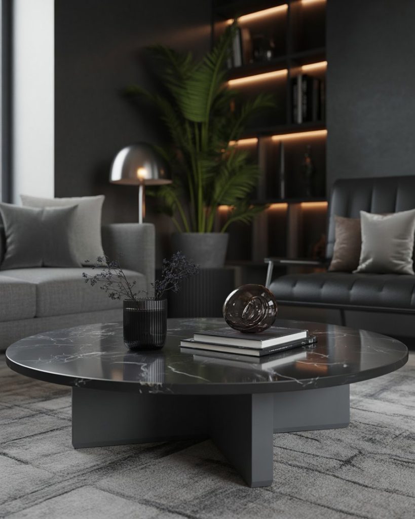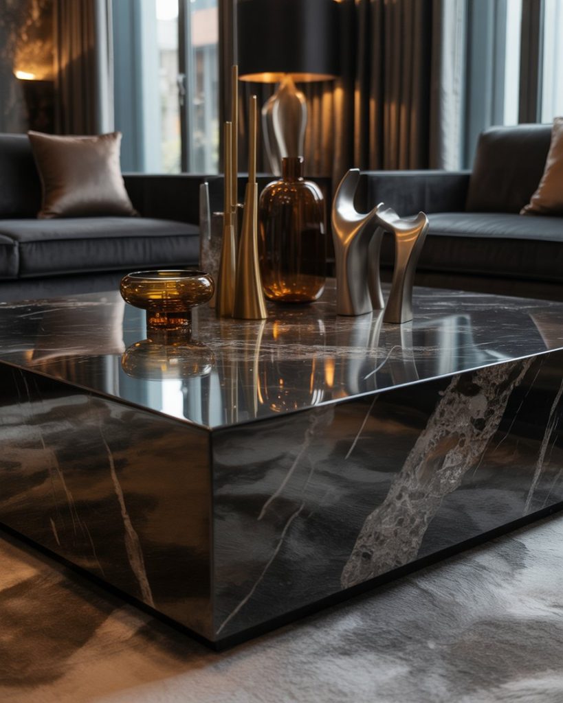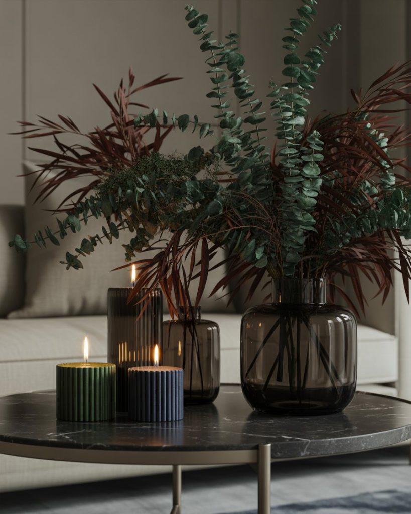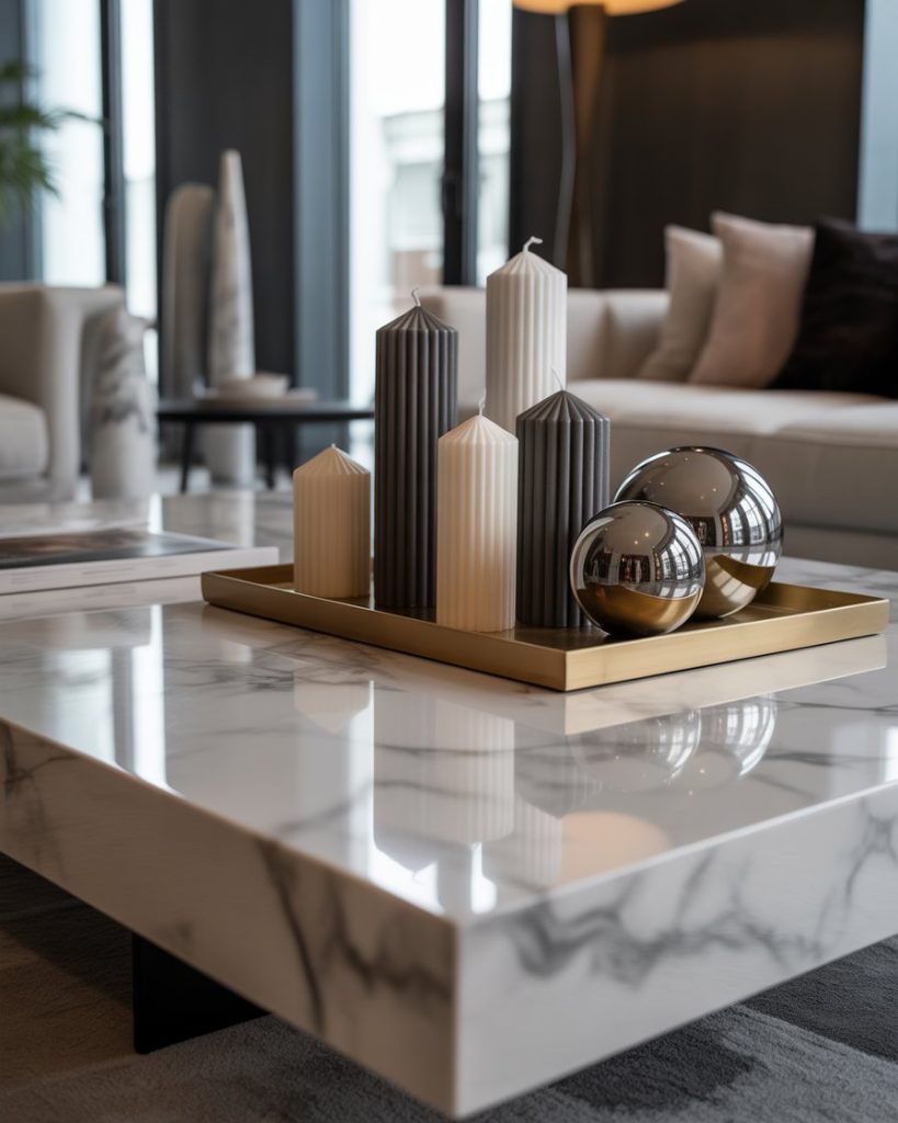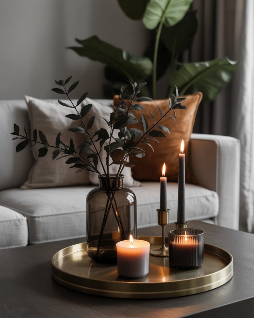 A moodier, darker, and more dramatic idea uses deep tones and bold textures. Think dark marble, black metal candles, or tinted glass pieces that instantly feel luxurious. If your living room has deep green or charcoal accents, this style visually anchors the space and adds depth. I once saw this done in a small studio, and the rich contrast made everything feel intentional.