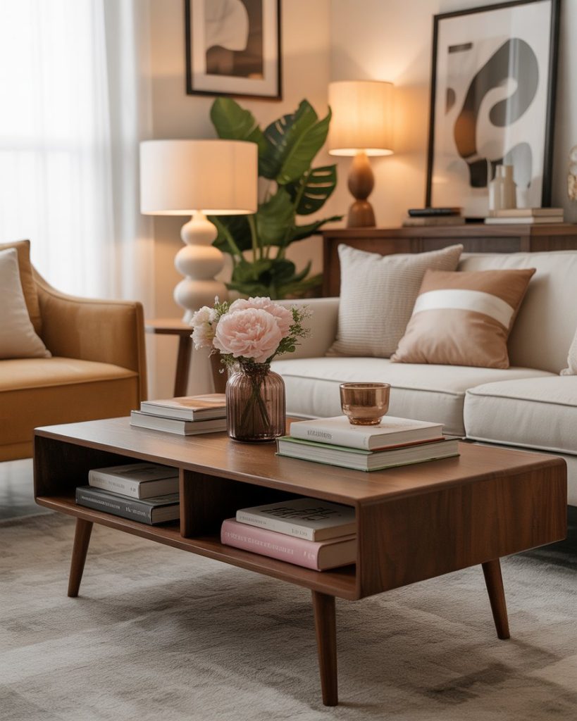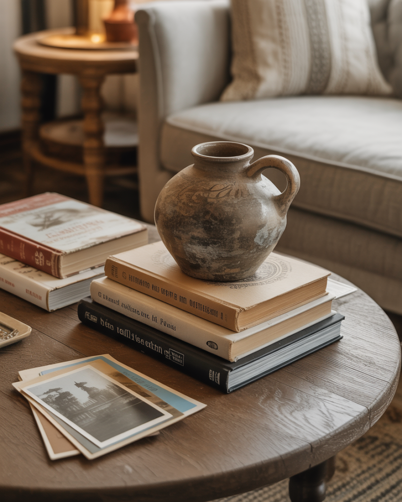 For lovers of character-rich decor, a vintage collection of stacked books, postcards, and aged pottery makes the coffee table feel storied and charming. This approach is perfect for older homes or eclectic apartments where residents enjoy surrounding themselves with meaningful objects. It creates warmth and personality without compromising style.