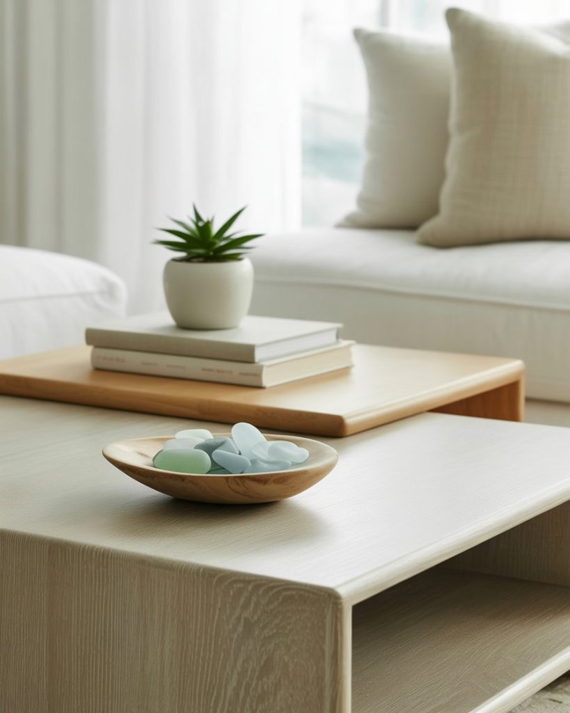 This idea blends coastal serenity with minimalist balance, using whitewashed trays, seashell shapes, and soft linen textures. It suits bright homes or beach-inspired interiors where a clean, airy feeling matters. Even one small coastal object can make the table look relaxing and modern without feeling themed or overdone.
