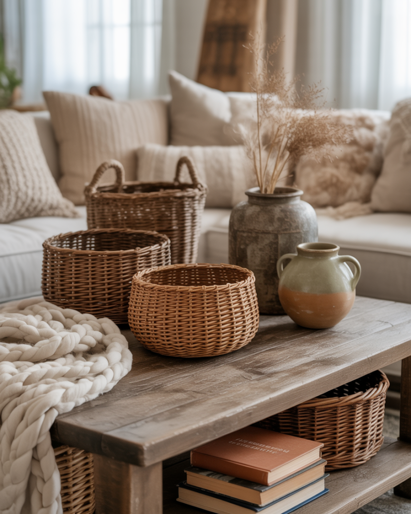 A rustic farmhouse appearance exhibits woven storage solutions, distressed wooden pieces, and soft cotton materials to form a comfortable, relaxing layout. It works best with individuals who enjoy outdated, traditional, and simplistic styles. It works wonderfully to get a family home and helps provide a living room with some comfort, charm, and functional approaches.