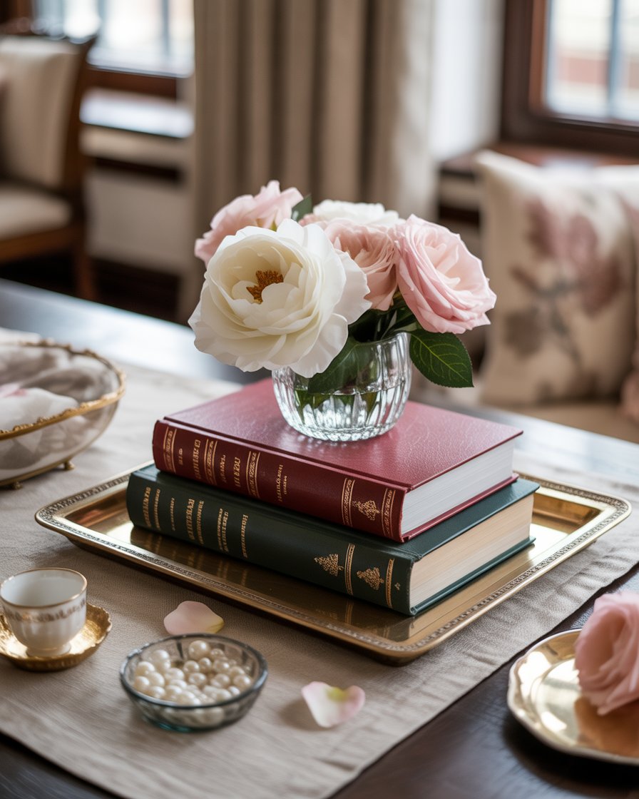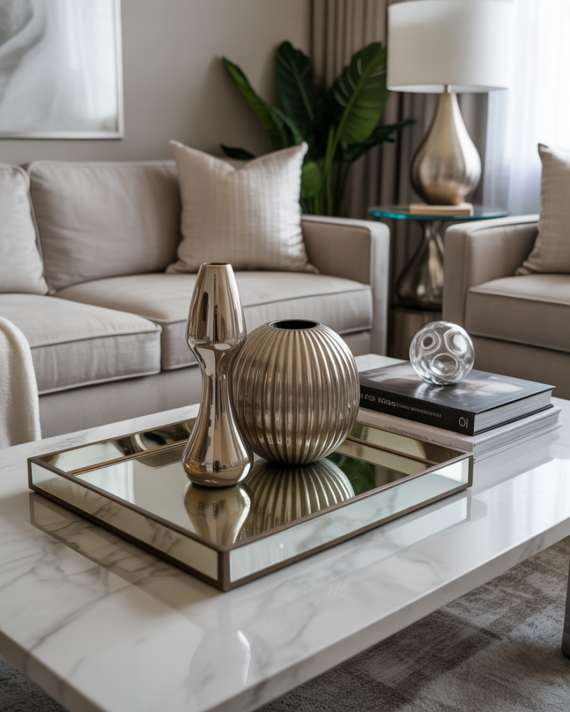 A bold interior luxury idea uses mirrored trays, metallic pieces, glossy books, and sculptural objects to create a glamorous, eye-catching table. This works in modern upscale apartments where residents appreciate dramatic highlights. The polished surfaces and reflective elements add sparkle without overwhelming the room.