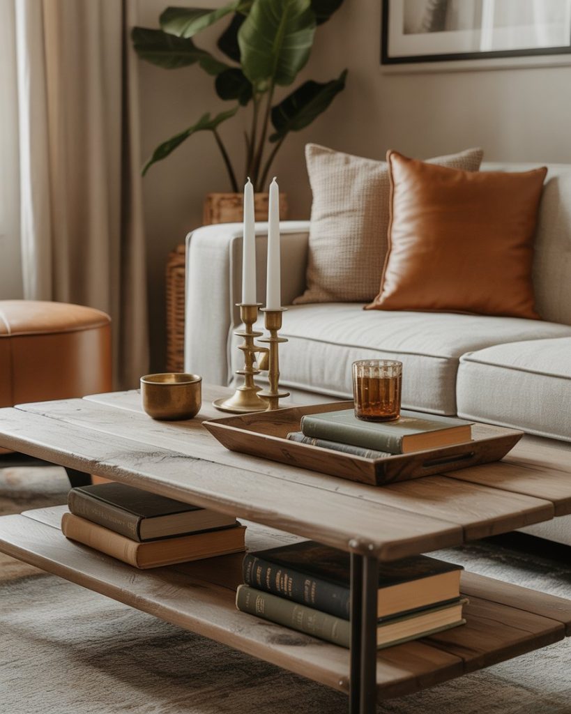 Blending rustic and vintage pieces on a coffee table adds charm and nostalgia. Old books, brass candleholders, and a distressed wooden tray create a story-filled arrangement that feels grounded in history. Many classic American homes already have these items tucked away, making it a meaningful way to decorate without buying new decor.