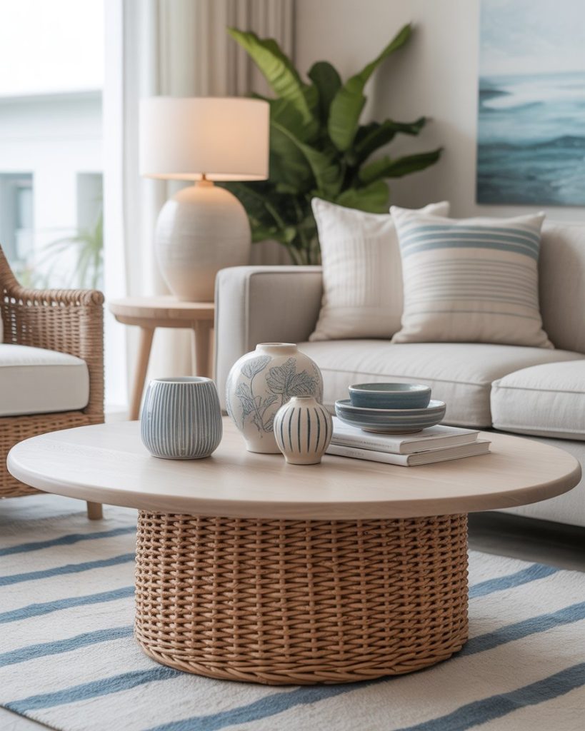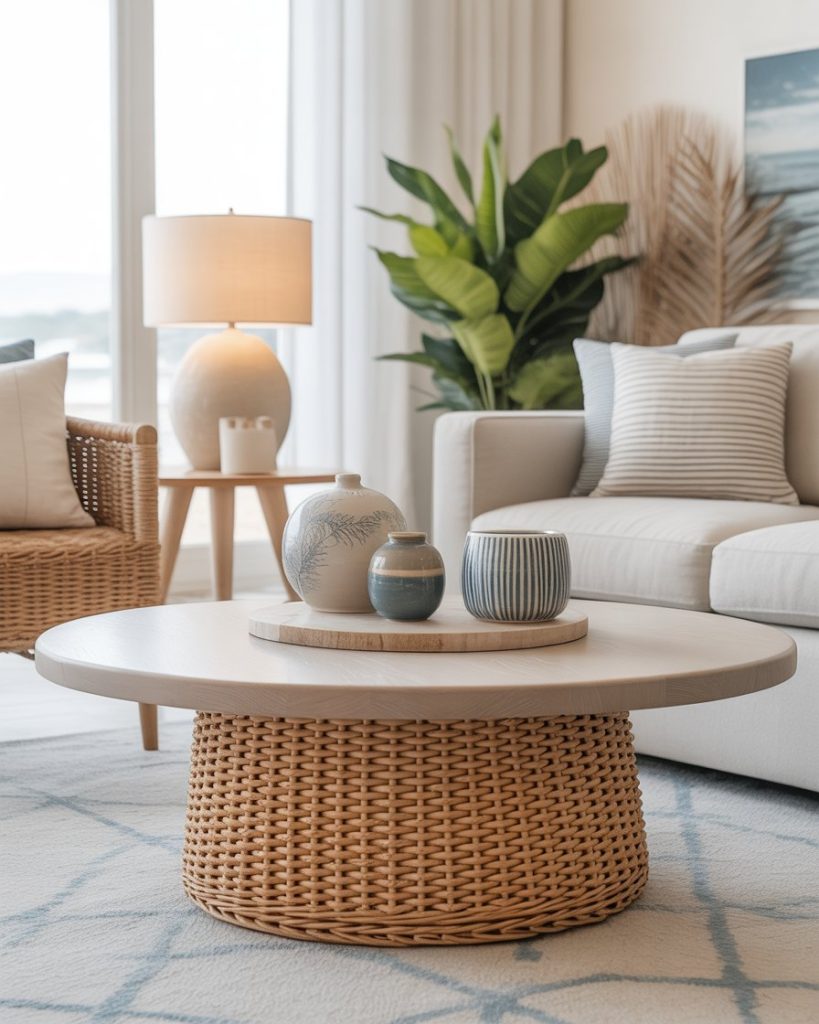 A coastal layout embraces breezy textures like light wood, woven coasters, or sea-inspired ceramics. It feels refreshing and perfect for anyone who loves beachy tones, even if they don’t live near the water. The light, airy mood pairs well with soft blues and natural materials, giving your living room a brighter, more open feel.