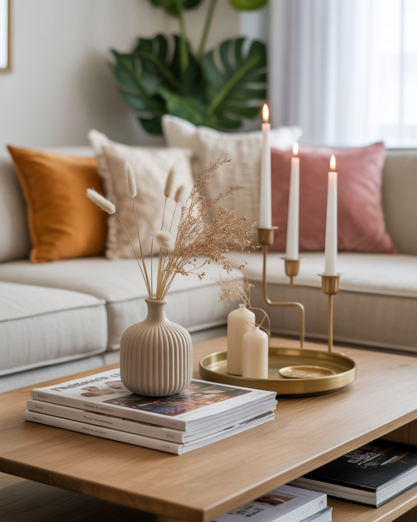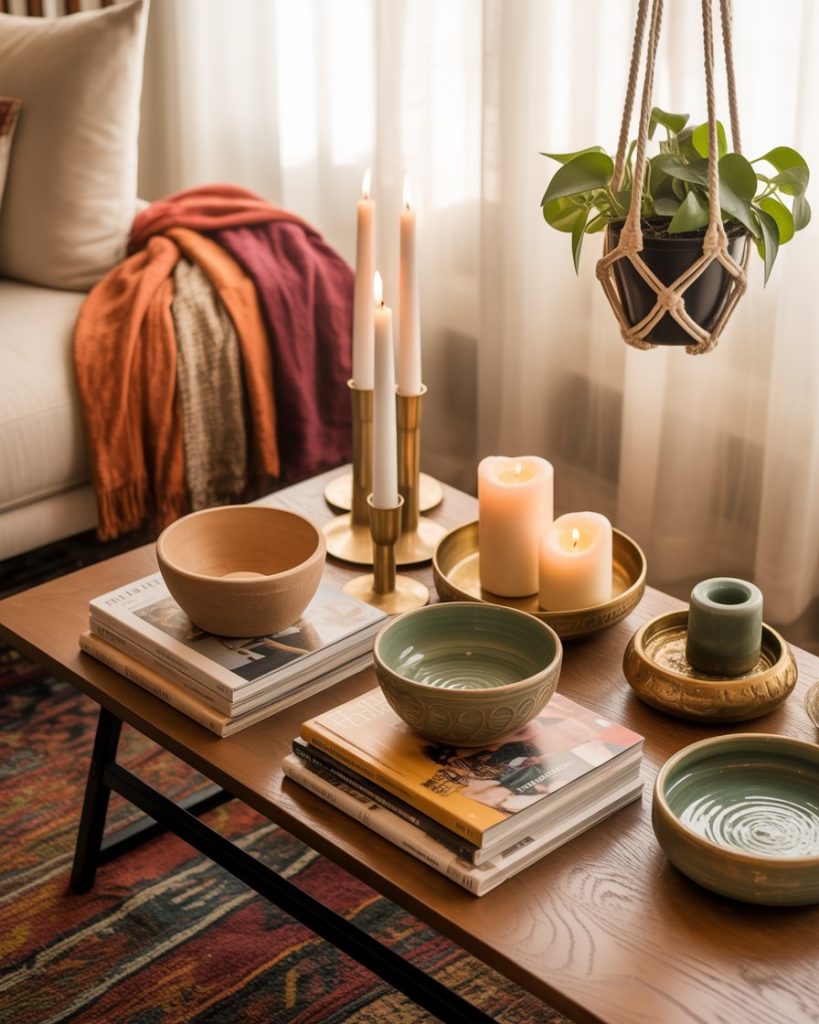 A boho approach brings color, pattern, and relaxed charm to your table. Layered magazines, candles, and small handcrafted objects create a playful environment that looks collected rather than arranged. This style works especially well for creative people who want their living room to show personality instead of formality.