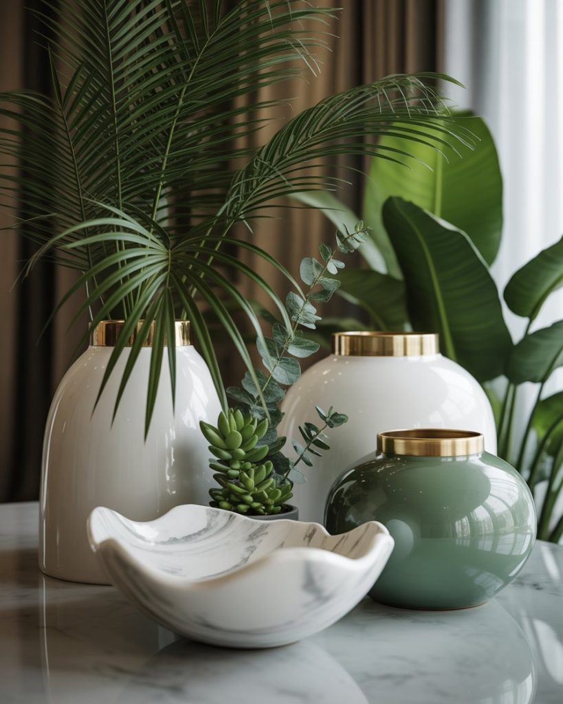 A tropical and design luxury mix adds modern freshness with palm leaves, glossy ceramics, or sculptural fruit bowls. The combination of greenery and sleek accessories feels resort-like without being overwhelming. I once added a single tropical stem to a friend’s table, and it instantly elevated the entire room.