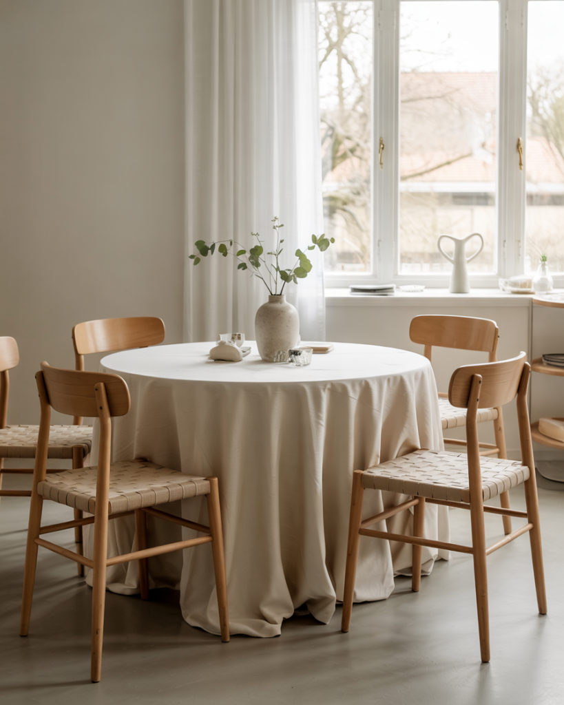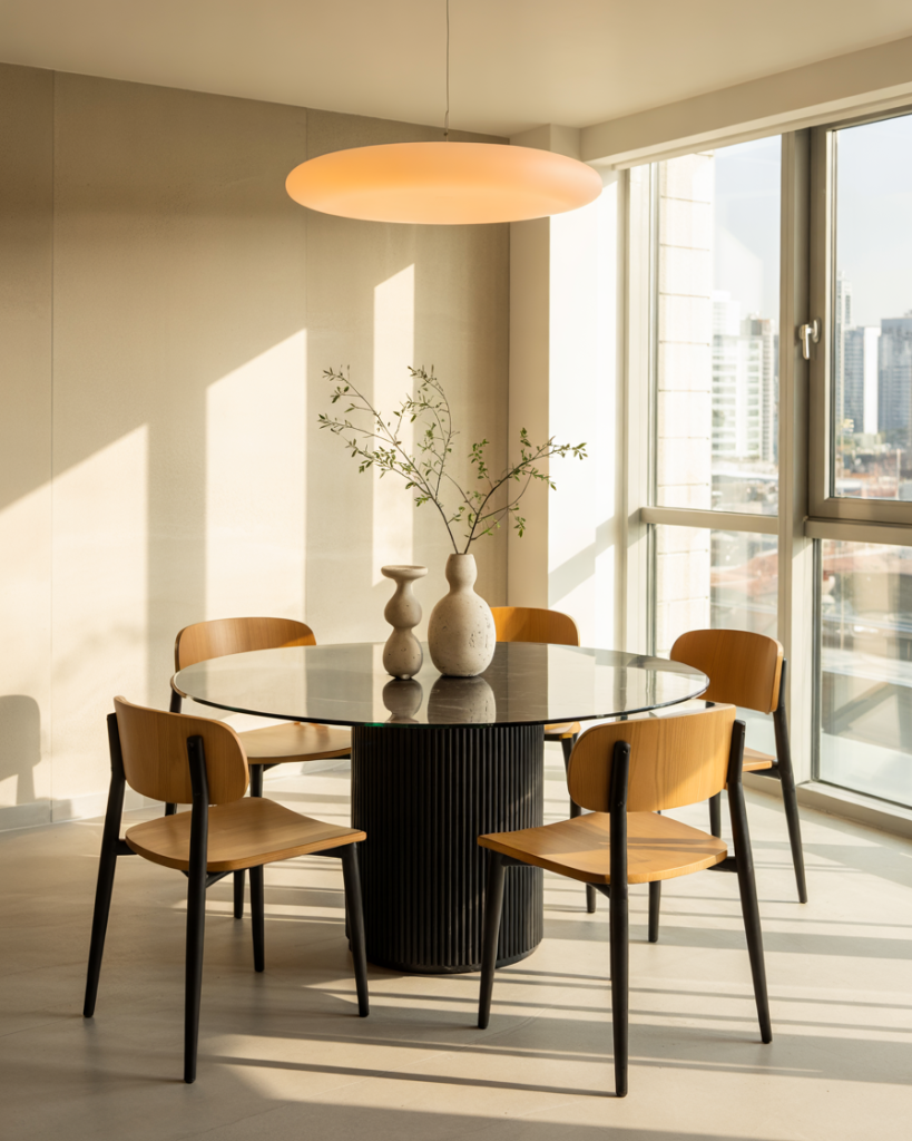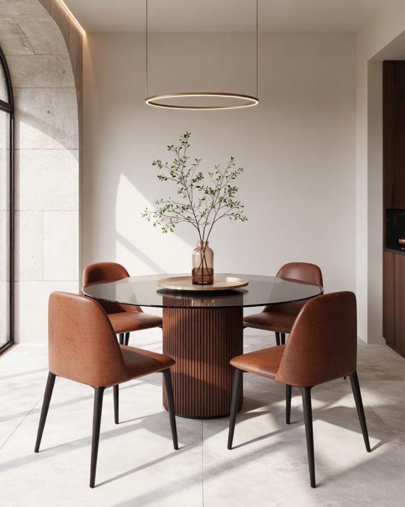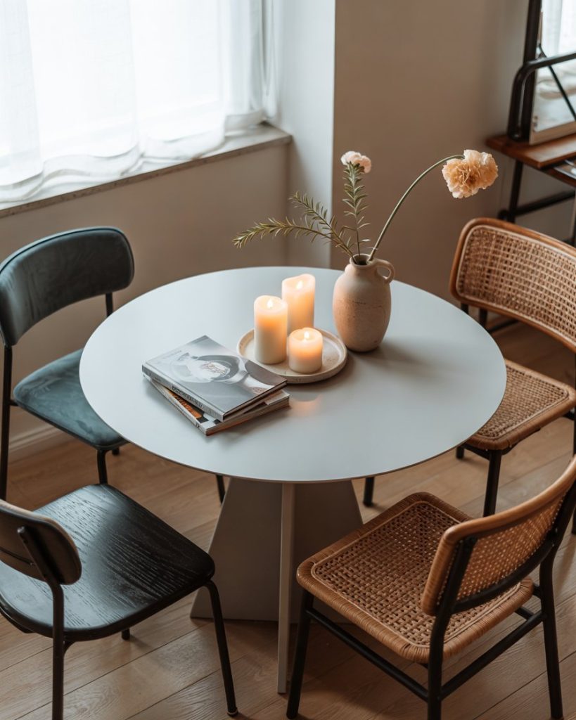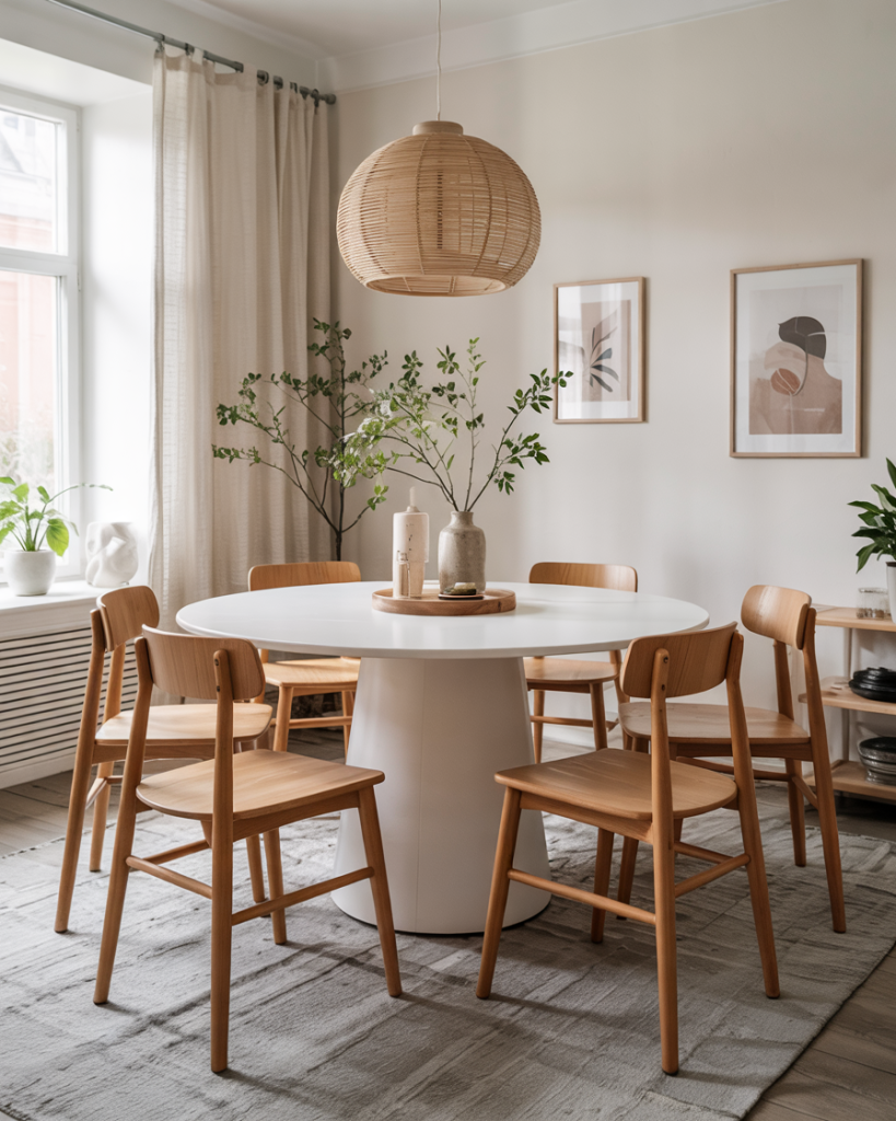 A bold round white table paired with pale wood chairs and soft textiles brings that relaxed Nordic charm many small apartments crave. This look thrives on natural light, simple ceramics, and unfussy greenery, proving you don’t need a big budget to feel calm and collected at dinner. Designers like Emily Henderson swear by layered neutrals and gentle curves to avoid visual clutter while keeping the room inviting for both breakfast and late-night tea.