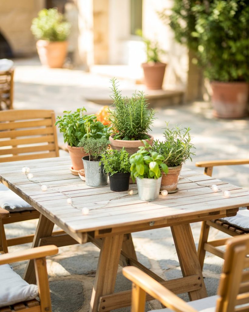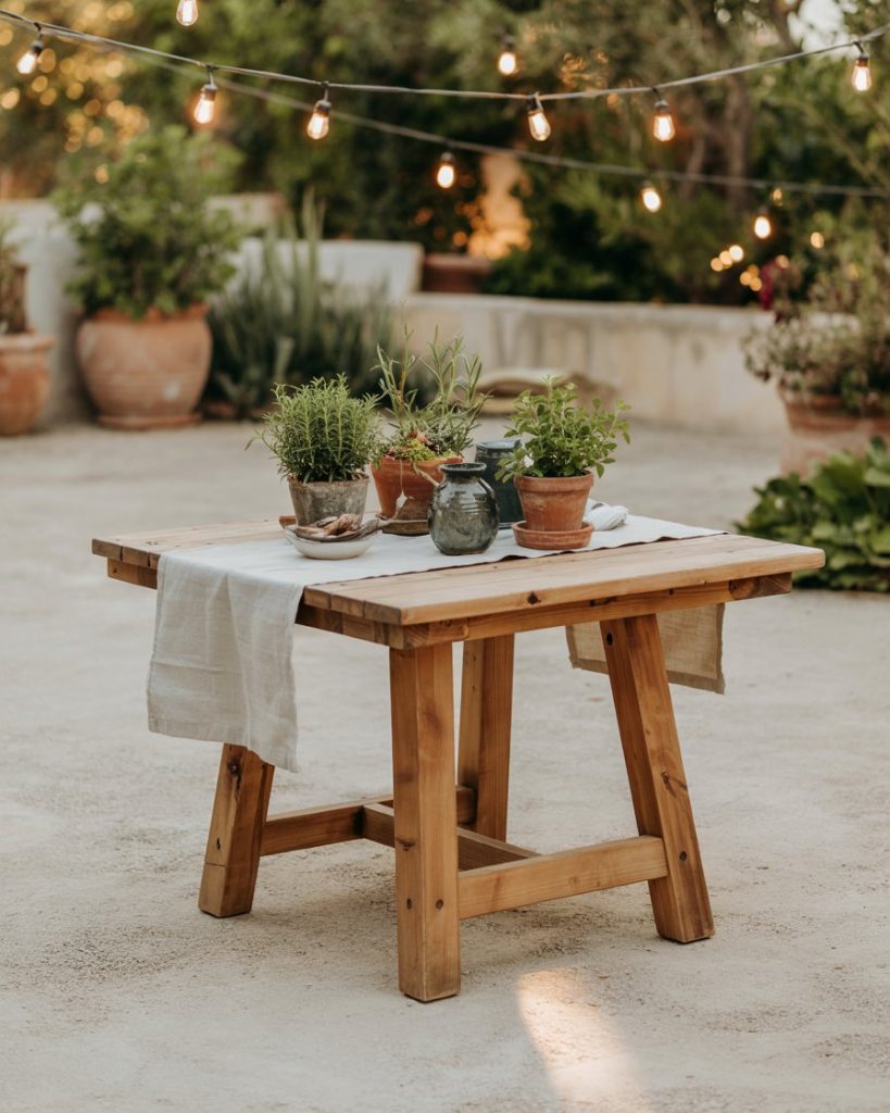 A bold outdoor wooden square table transforms patios into mini vacation spots. String lights, terracotta herb pots, and mismatched chairs invite guests to linger long after sunset. Gardenista predicts outdoor dining will keep booming in 2026 as homeowners blur indoor and backyard living. The square shape works well against deck railings, leaving space for a grill or planter bench.