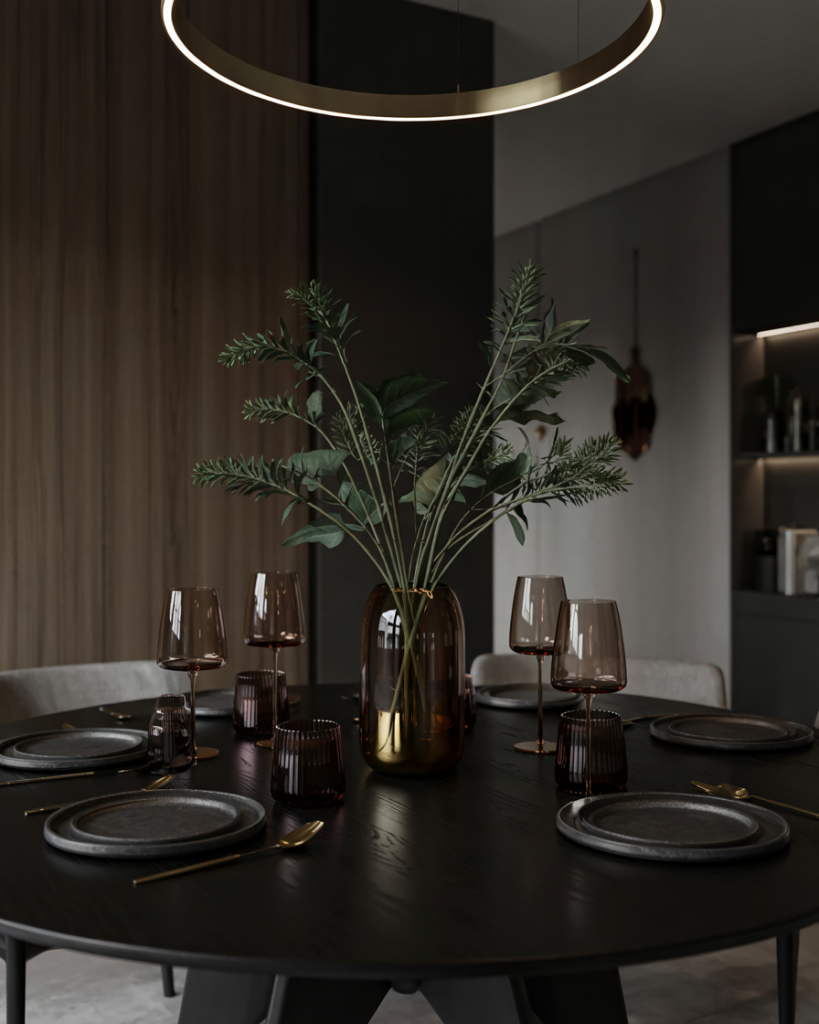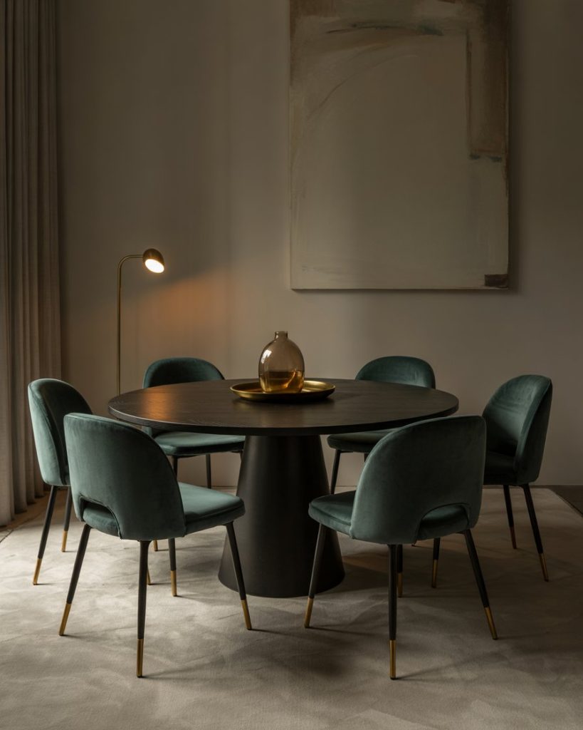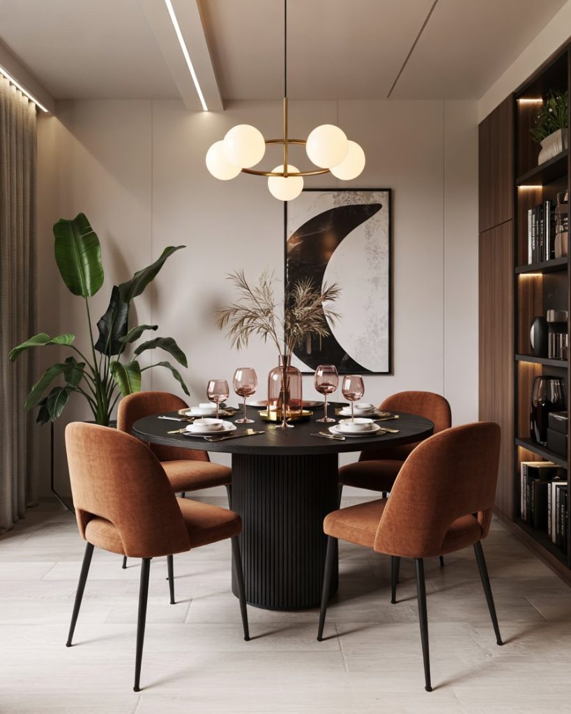 A bold black round table instantly anchors a room with sculptural presence, especially when paired with velvet chairs or smoked-glass tumblers. The monochrome look feels bold but not cold if you add a single warm accent—like a caramel leather cushion or brass napkin ring. Designers at CB2 note that circular silhouettes encourage conversation, making this setup perfect for long chats over wine without anyone feeling left out.