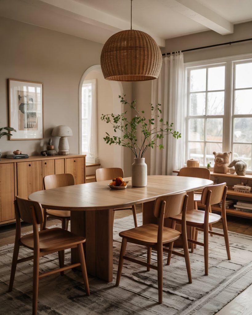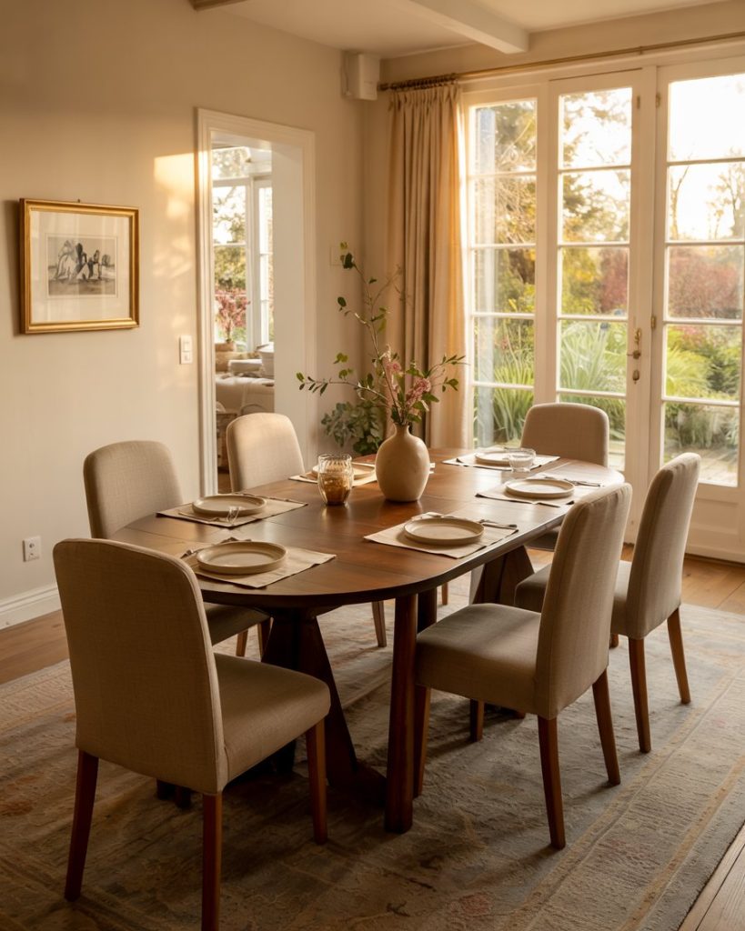A bold oval wooden table softens sharp corners and gives families easier movement around the space. Kids can slide in without bumping edges, and the elongated curve still seats plenty of guests. I once watched a family of seven squeeze in extra chairs, and nobody felt trapped. Apartment Therapy’s editors love oval tables because they visually stretch narrow rooms while keeping a relaxed, welcoming vibe.