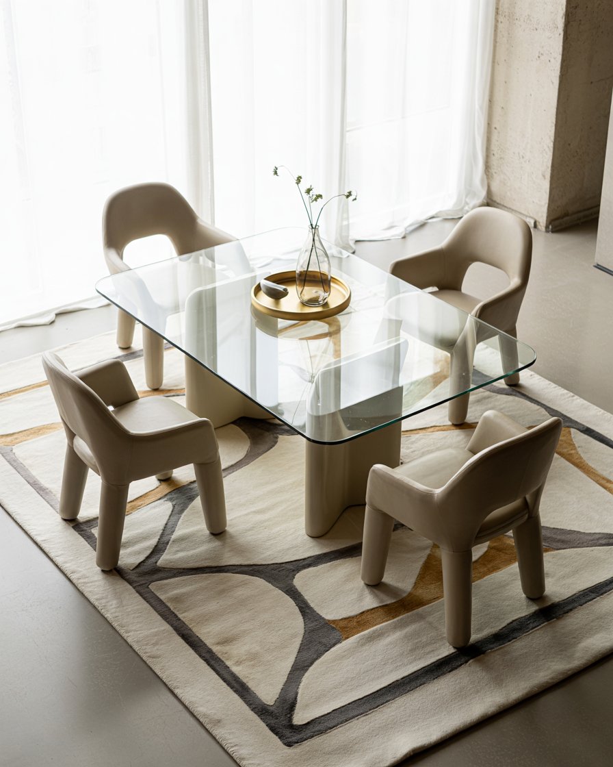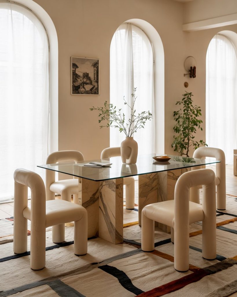 A bold glass rectangle table paired with sculptural chairs turns dinner into an art exhibit. The transparent top shows off rugs, chrome bases, or even checkerboard floors beneath. This works well in open-plan lofts where furniture doubles as décor. The clear surface also encourages decluttering—anything messy becomes instantly visible, so you naturally keep it styled like a gallery set.